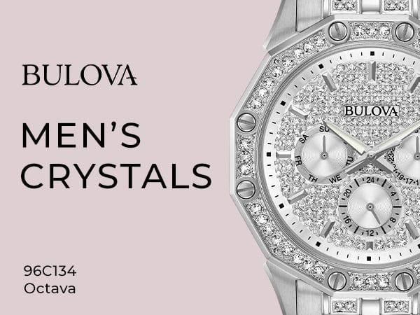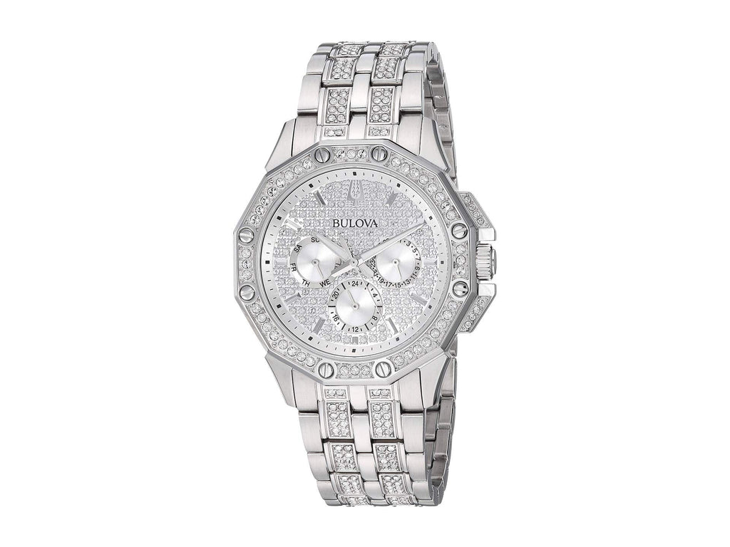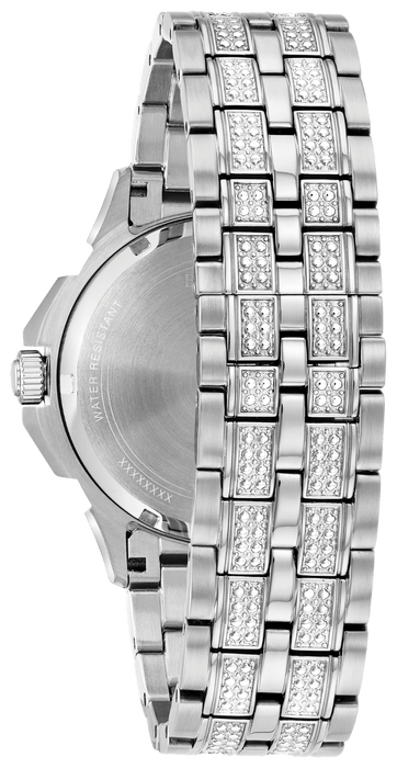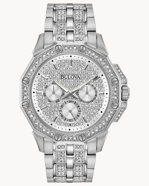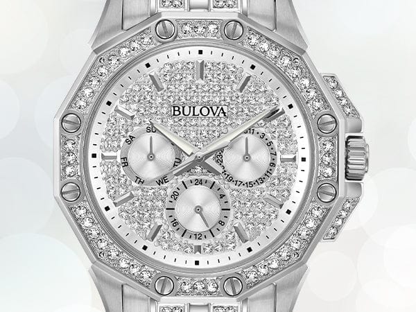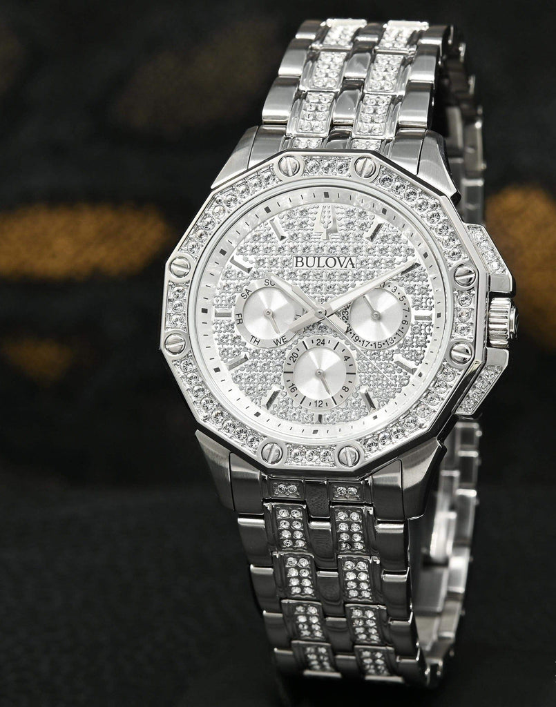 - Multi-function dress watch boldly embellished with 300 Swarovski Crystals on the stainless steel case and bracelet, and the pave set six-hand silver white dial.