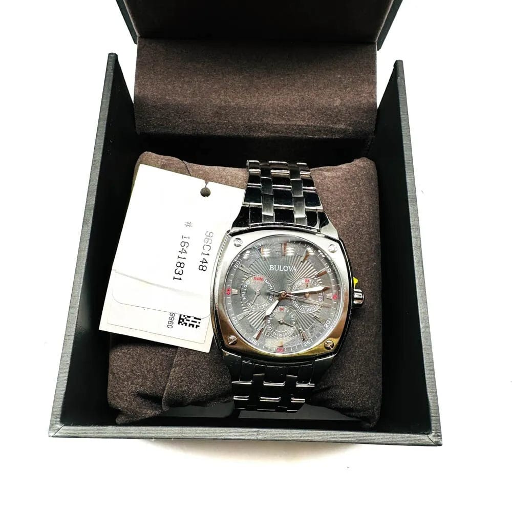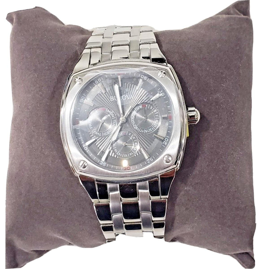 Bulova watch classic collection for Men. 6-hand quartz movement and Dater. Square case and bracelet with double push-button folding clasp made of stainless steel. Top bezel fixed with 4 screws. Gray dial with silver luminescent hands and indexes. Mineral glass. Water resistance up to 30 meters.