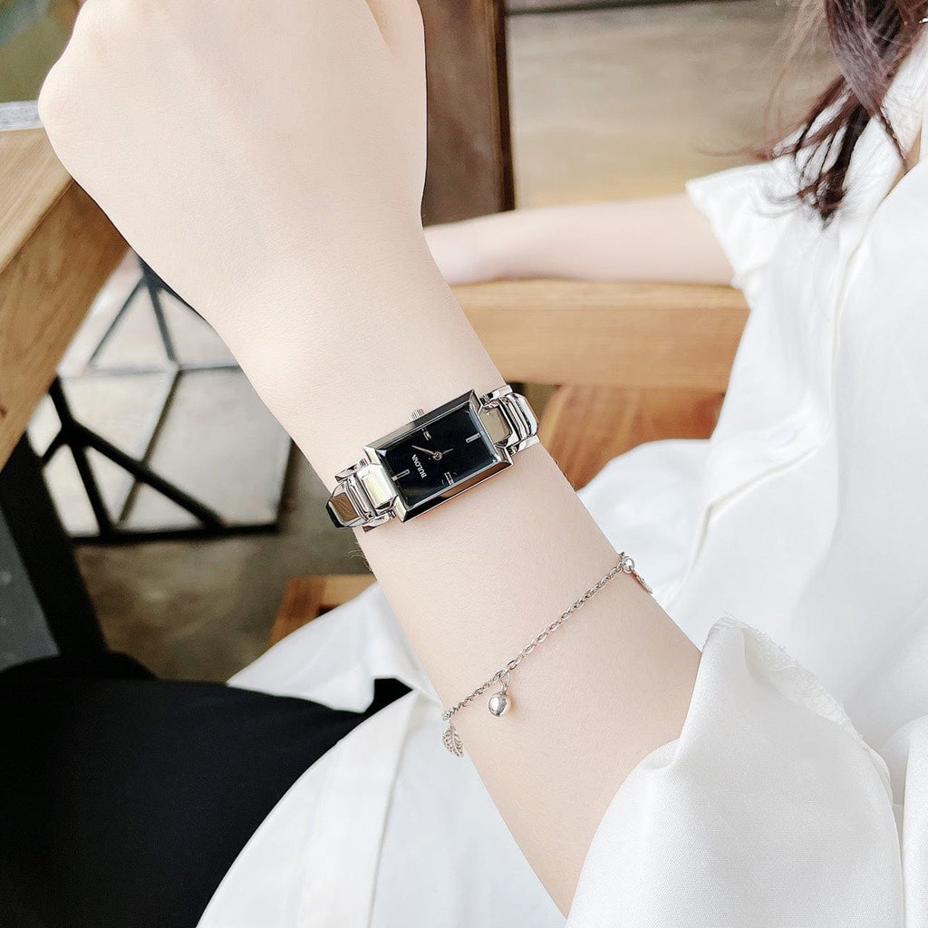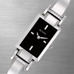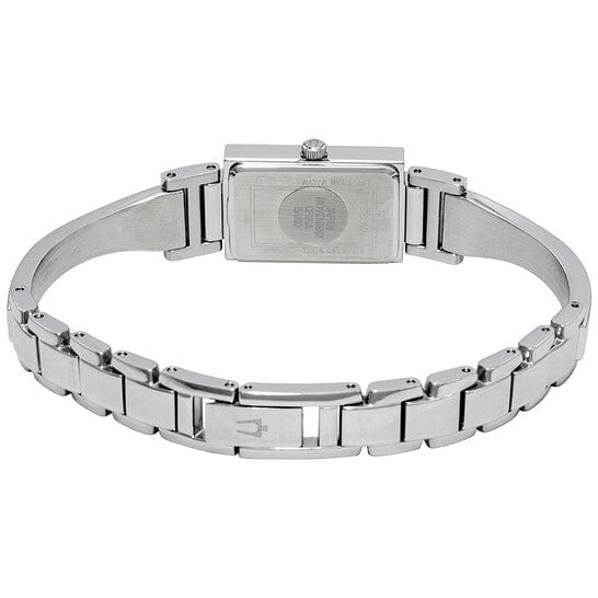 Stainless steel case with a stainless steel bracelet. Fixed stainless steel bezel. Black dial with silver-tone hands and s hour markers. The Bulova logo appears at the 12 o'clock position. Index markers at the 3, 6 and 9 o'clock positions. Dial Type: Analog. Quartz movement. Scratch resistant mineral crystal. Pull / push crown. Solid case back. Rectangle case shape. Case size: 21 mm. Case thickness: 9 mm. Band width: 10 mm. Jewelry clasp. Water resistant at 30 meters / 100 feet. Functions: hour, minute. Additional Info: withstands rain and splashes of water, but not showering or submersion. Casual watch style. Bulova Casual Black Dial Stainless Steel Ladies Watch 96L138