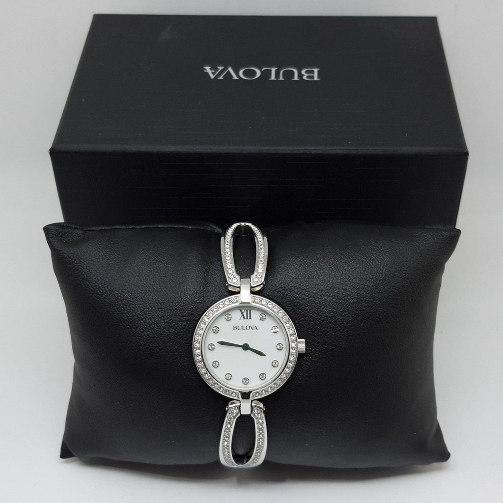 Stainless steel case with a stainless steel bracelet set with Swarovski crystals. Fixed stainless steel bezel set with Swarovski crystals. Mother of pearl dial with silver-tone hands and crystal hour markers. Roman numeral appears at the 12 o'clock positions. Dial Type: Analog. Quartz movement. Scratch resistant mineral crystal. Pull / push crown. Solid case back. Round case shape. Case size: 26 mm. Case thickness: 6.1 mm. Jewelry clasp. Water resistant at 30 meters / 100 feet. Functions: hour, minute. Dress watch style. Bulova Quartz Crystal Ladies Watch 96L223.