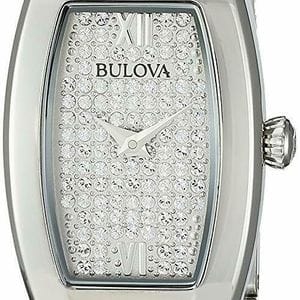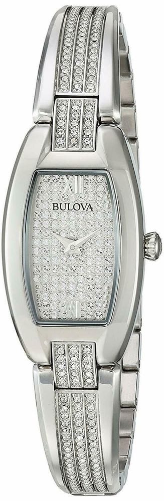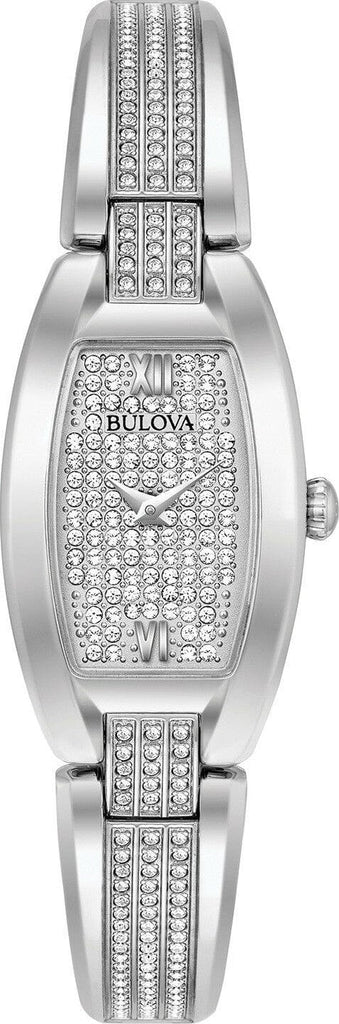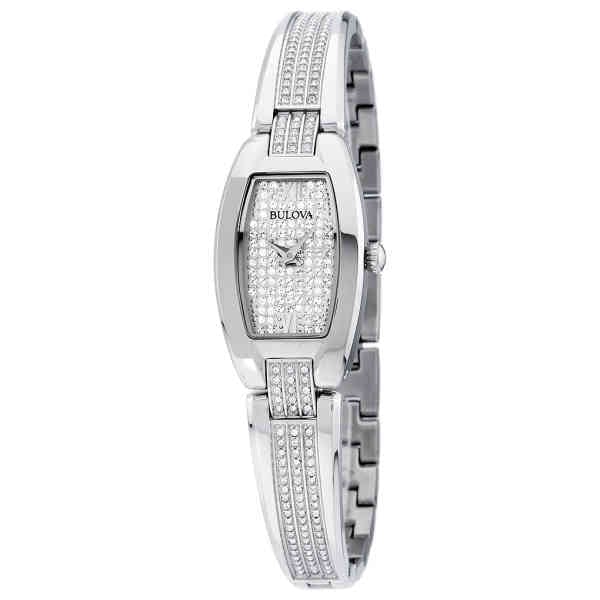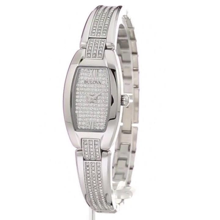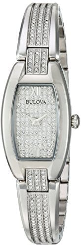 Bulova Women’s Crystal Watch 96L235 from the Crystals Collection. In stainless steel embellished with 259 Swarovski® Crystals on bangle-style bracelet and full pavé dial, curved mineral glass, stainless bracelet with jewelry clasp closure, and water resistance to 30 meters.