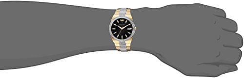 Gold ion-plated stainless steel case with a two-tone (silver-tone and gold ion-plated) stainless steel bracelet. Fixed stainless steel bezel set with crystals. Black bi-level sunray dial with luminous gold-tone hands and crystal-tipped index hour markers. An Arabic numeral appears at the 12 o'clock position. Minute markers. Arabic numeral minute markers (at 5 minute intervals) around the outer rim. Dial Type: Analog. Luminescent hands and markers.