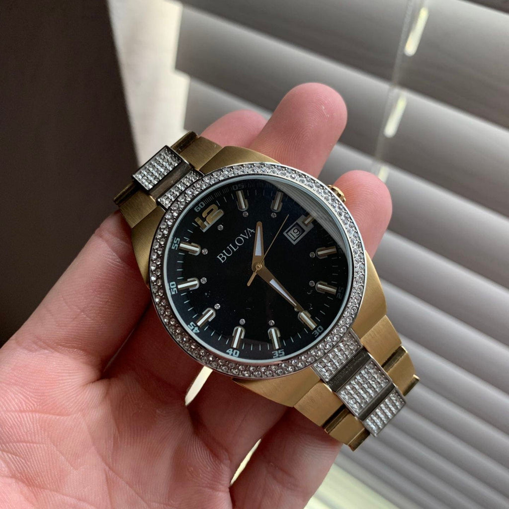Date display at the 3 o'clock position. Quartz movement. Scratch resistant mineral crystal. Pull / push crown. Solid case back. Round case shape. Case size: 43 mm. Case thickness: 10.9 mm. Band width: 22 mm. Fold over clasp with a safety release. Water resistant at 100 meters / 330 feet. Functions: date, hour, minute, second. Additional Info: case, bracelet, and dial set with 323 crystals. Crystal Series. Dress watch style. Watch label: Japan Movt. Bulova Crystal Black Bi-level Sunray Dial Men's Watch 98B235.