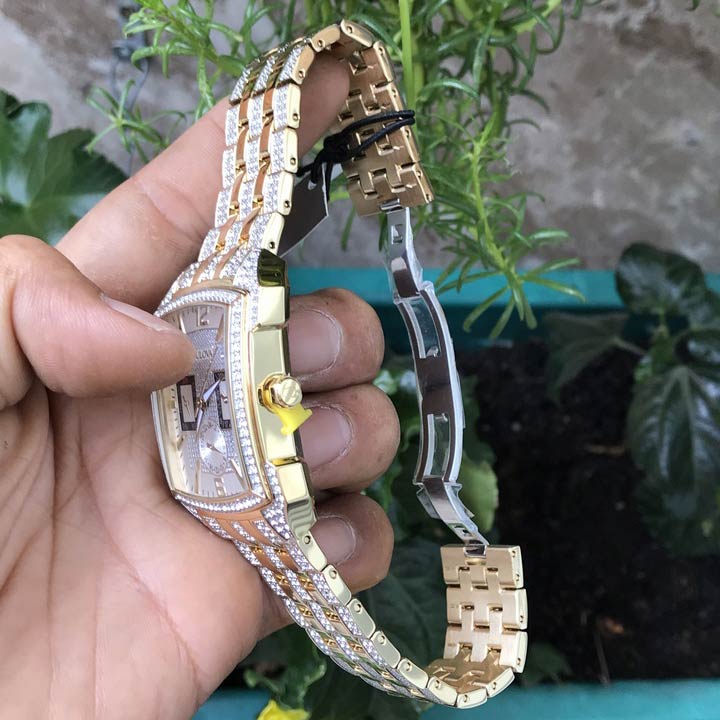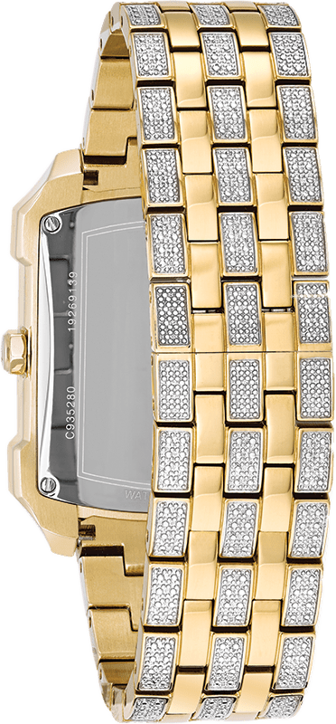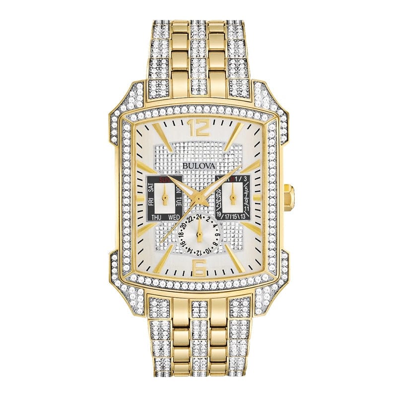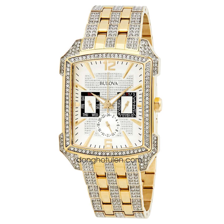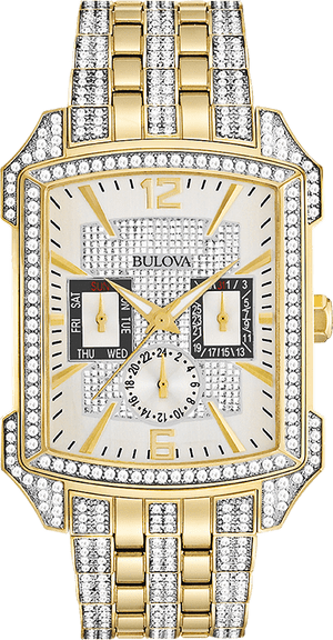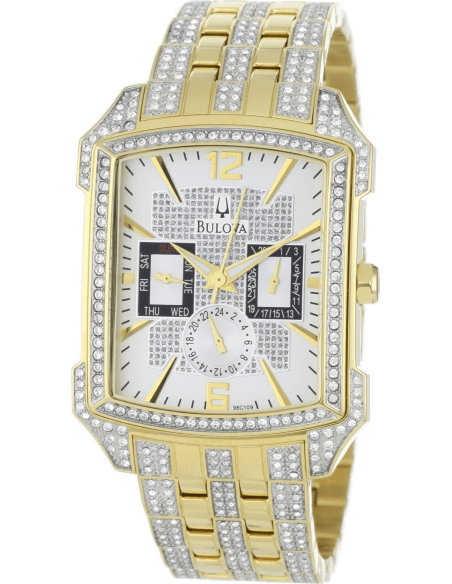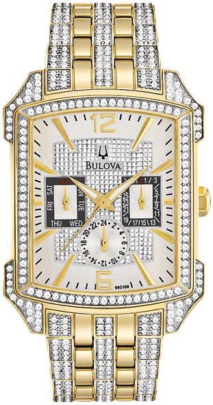 Quartz movement. Scratch resistant mineral crystal. Pull / push crown. Solid case back. Rectangle case shape. Case size: 36 mm. Case thickness: 11.9 mm. Band width: 22 mm. Deployment clasp. Water resistant at 30 meters / 100 feet. Functions: chronograph, day, date, hour, minute, second. Additional Info: 358 Swarovski crystals encrusted in the dial, band and bezel. Withstands rain and splashes of water, but not showering or submersion. Dress watch style. Bulova Crystal Chronograph Silver Dial Men's Watch 98C109.