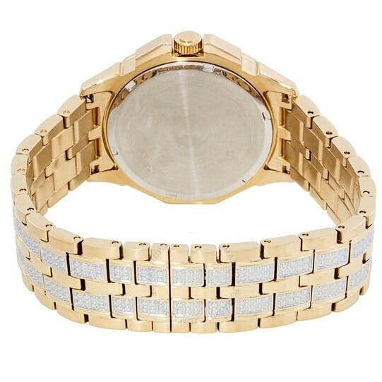 The luminous Swarovski crystal-encrusted dial, which underpins the gold embossed indices at the watch positions, is protected by a mineral glass. The contrasting golden hands are luminescent, making it easier to read the time in low-light conditions. At the heart of the watch is a battery-powered Miyota movement, which features a 24-hour time display, a date display in the sub-dial at the 3 o'clock position and a day display at the 9 o'clock position. Around the perimeter of the dial we find a decorative lunette made of sparkling crystals. The case and bracelet of the watch are made of stainless steel with a PVD finish in gold, and the bracelet stands out with an additional set of crystals. The watch is decorated with a total of 308 crystals. The water resistance of this watch is 30 meters, so it can handle moderate contact with water, such as rain or hand washing.