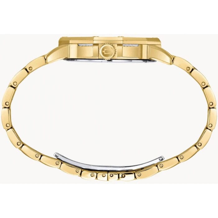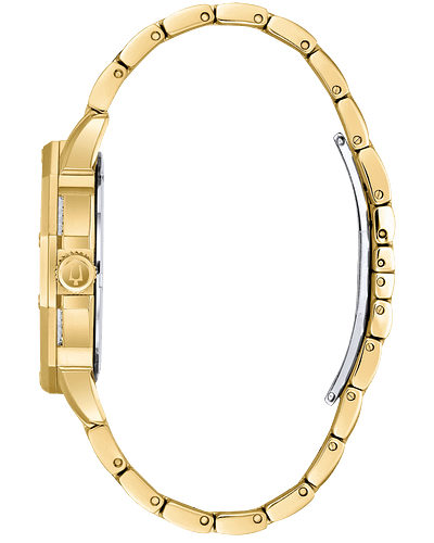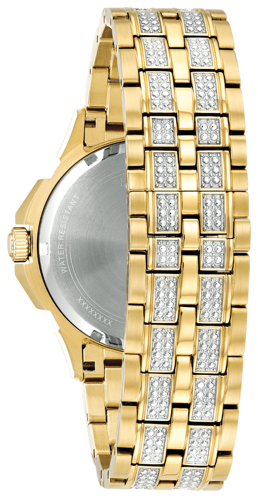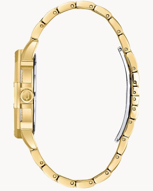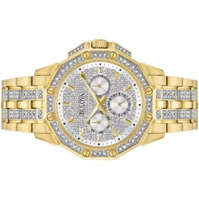 Silver Crystal-set dial enhanced by luminous yellow gold-tone hands. Yellow Gold-tone stainless steel case with a yellow gold-tone stainless steel set with swarovski crystals band. Quartz movement. 30 meters / 100 feet water resistance. Fixed bezel. Scratch Resistant Mineral crystal. Solid caseback. Deployment clasp. Pull / Push crown. Case size 41.7 mm x 10 mm. Band 22 mm x long. Bulova 98C126 Crystal Watch.