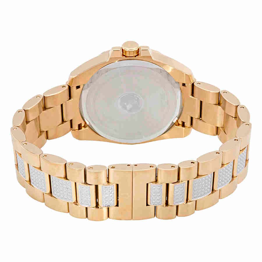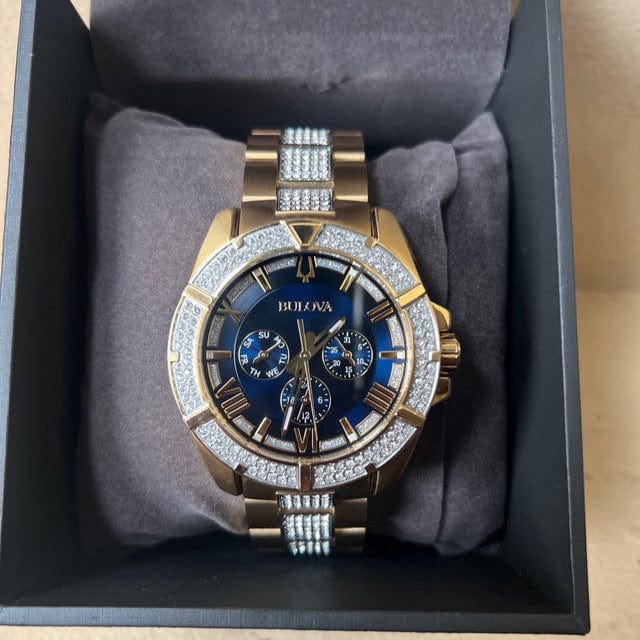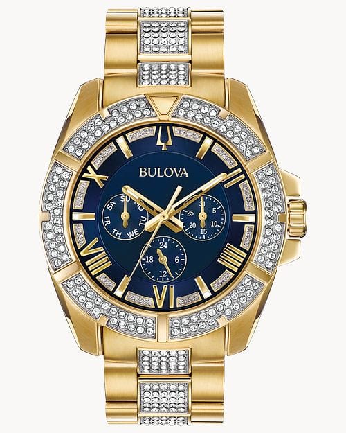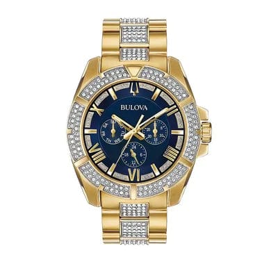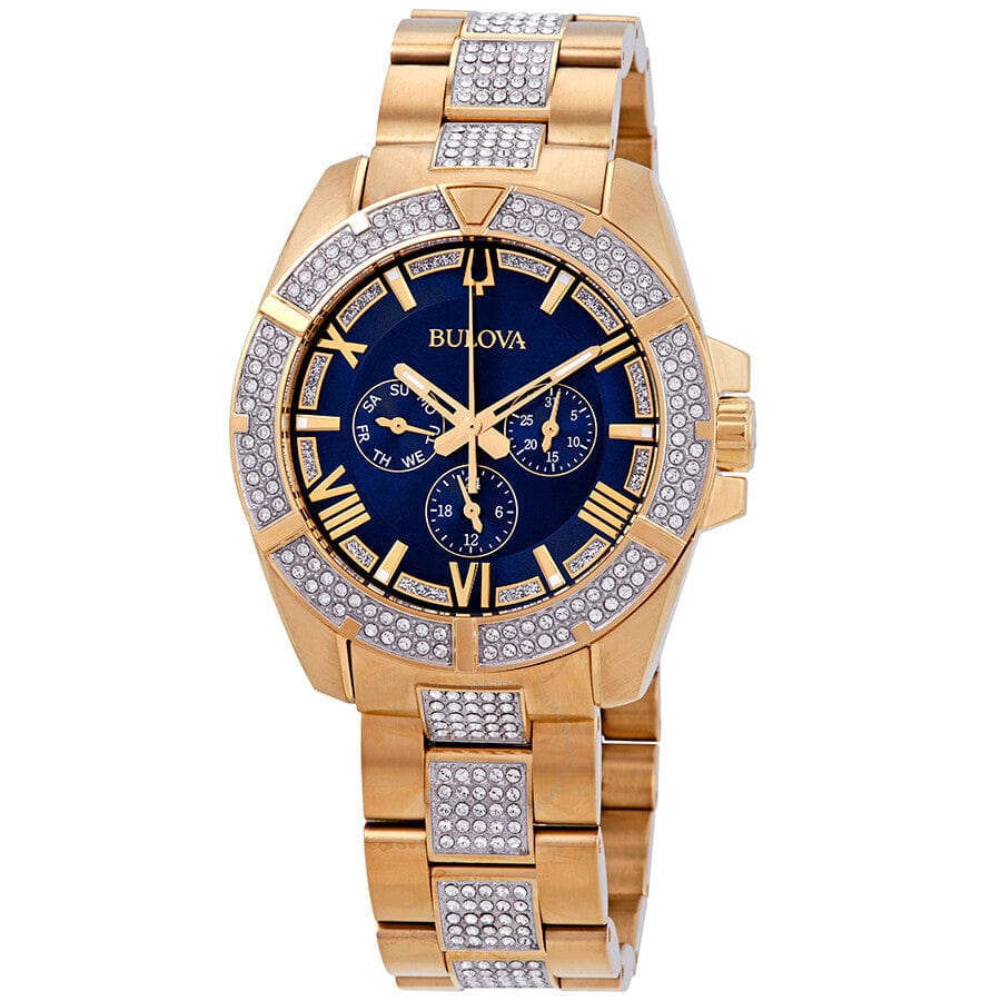 Yellow gold-tone stainless steel case with a yellow gold-tone stainless steel bracelet set with Swarovski crystal set links. Fixed yellow gold-tone bezel set with Swarovski crystals. Blue crystal-set dial with luminous yellow gold-tone hands and alternating index and Roman numeral hour markers. Minute markers around the outer rim. Dial Type: Analog. Luminescent hands and markers. Three multi-function sub-dials displaying: day of the week, date and 24 hour. Quartz movement. Scratch resistant mineral crystal. Solid case back. Round case shape. Case size: 44 mm. Case thickness: 11.5 mm. Band width: 22 mm. Deployment clasp. Water resistant at 30 meters / 100 feet. Functions: date, day, hour, minute, second. Additional Info: bezel, dial, and bracelet set with 318 Swarovski crystals. Dress watch style. Bulova Crystal Blue Dial Multifuncrtion Men's Watch 98C128.