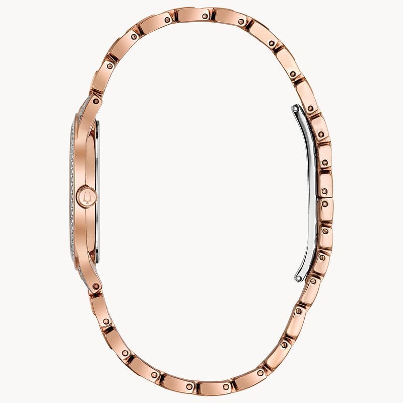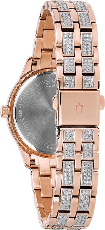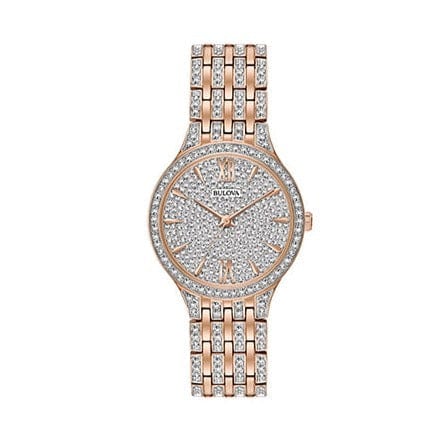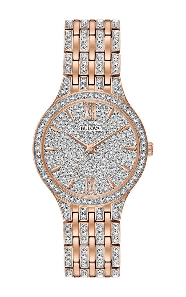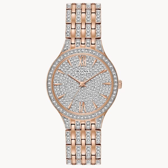 From the Ladies Crystals Collection. New slim dress styling in rose gold-tone stainless steel embellished with 440 Swarovski Crystals on bracelet, bezel and full-pav dial, deployant closure, and water resistance to 30 meters. Case size 32 mm.