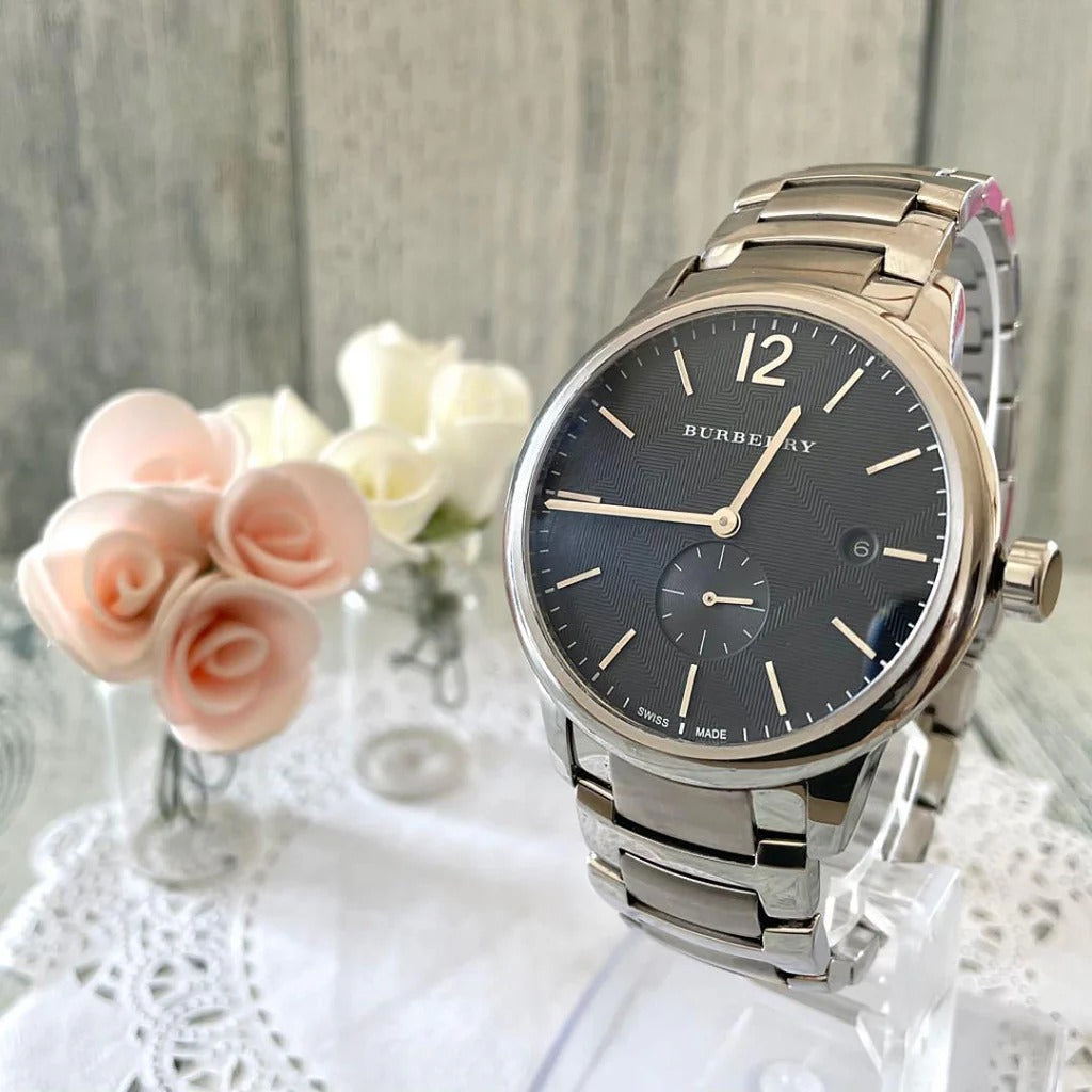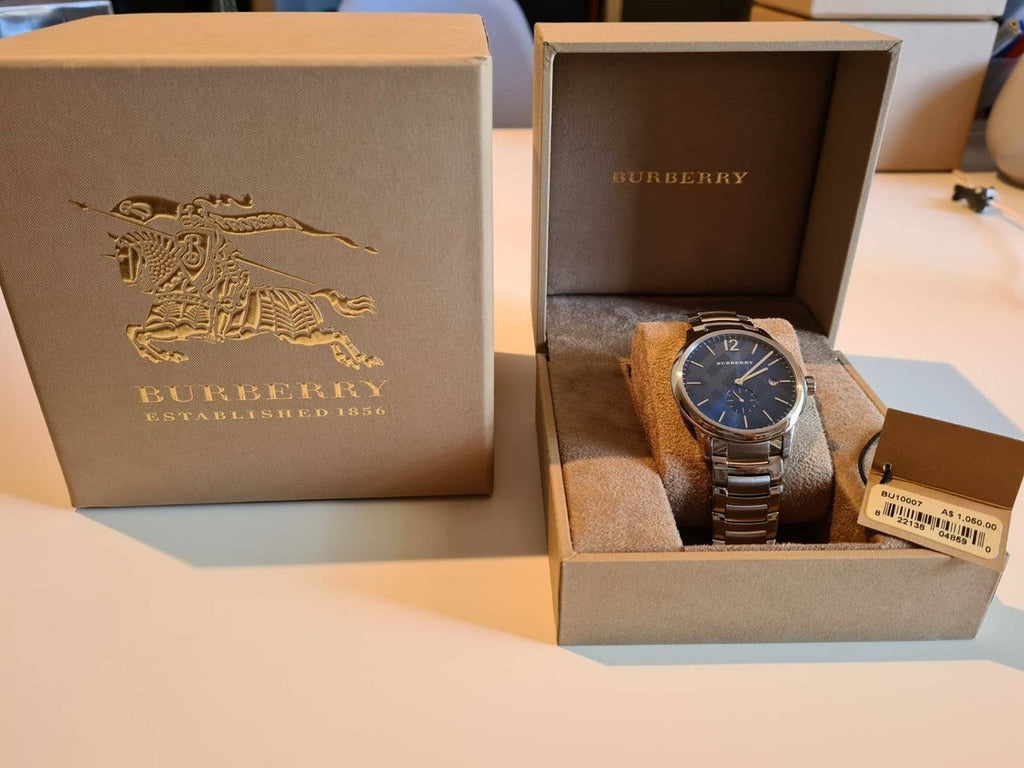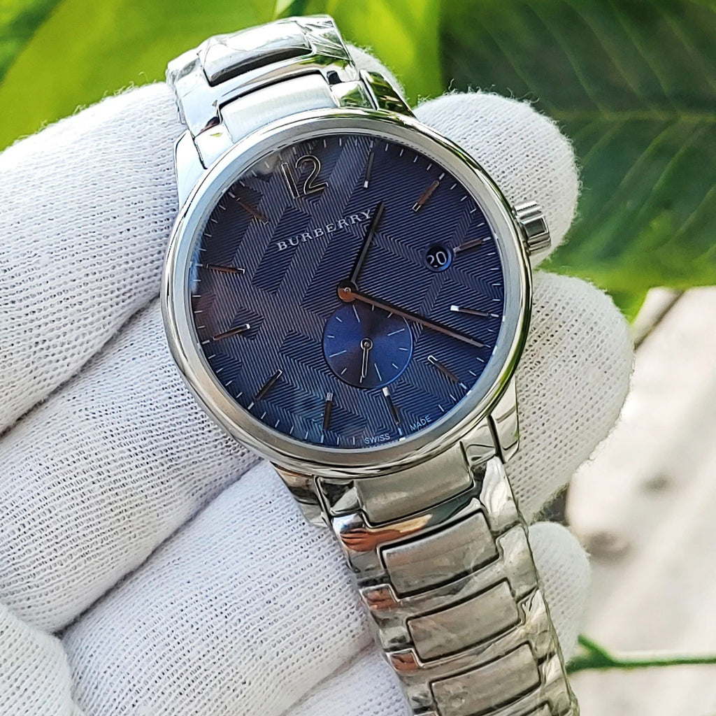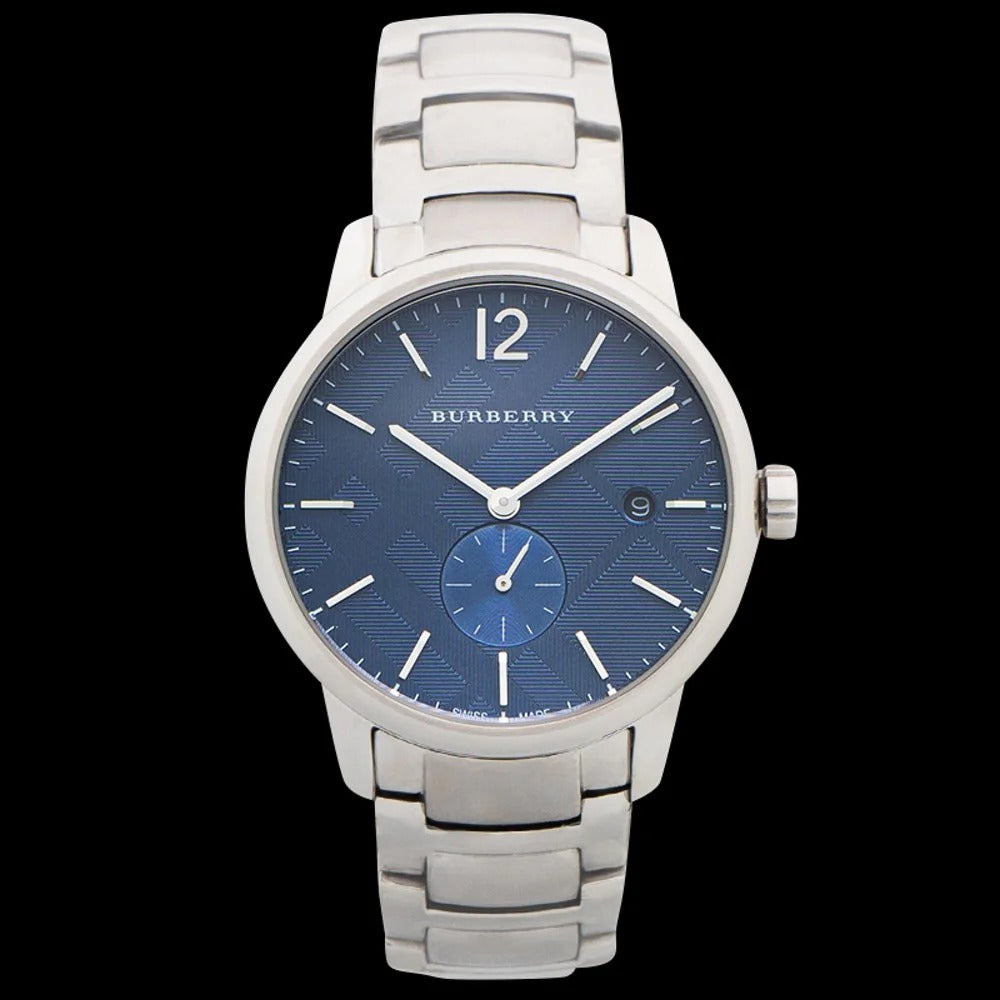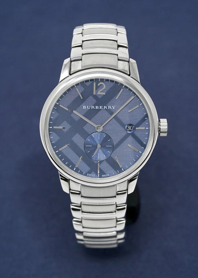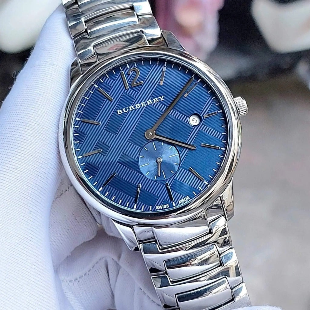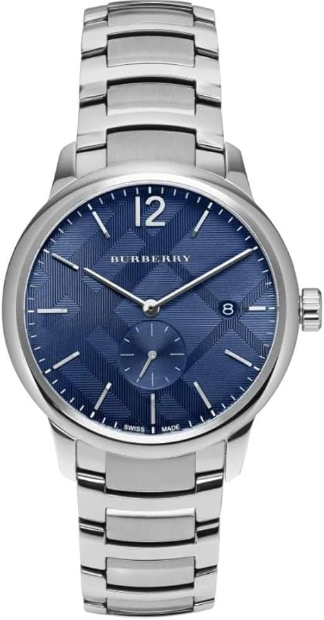 Timeless elegance meets everyday sophistication with the Burberry Classic Blue Dial Silver Steel Strap Watch. Featuring a striking blue dial that captures light beautifully, this men's timepiece combines refined aesthetics with reliable performance. The polished silver stainless steel strap offers durability and a premium feel, while the classic design ensures versatility for both professional and casual settings. The BU10007 model represents Burberry's commitment to quality craftsmanship and enduring style. A distinguished addition to any watch collection.