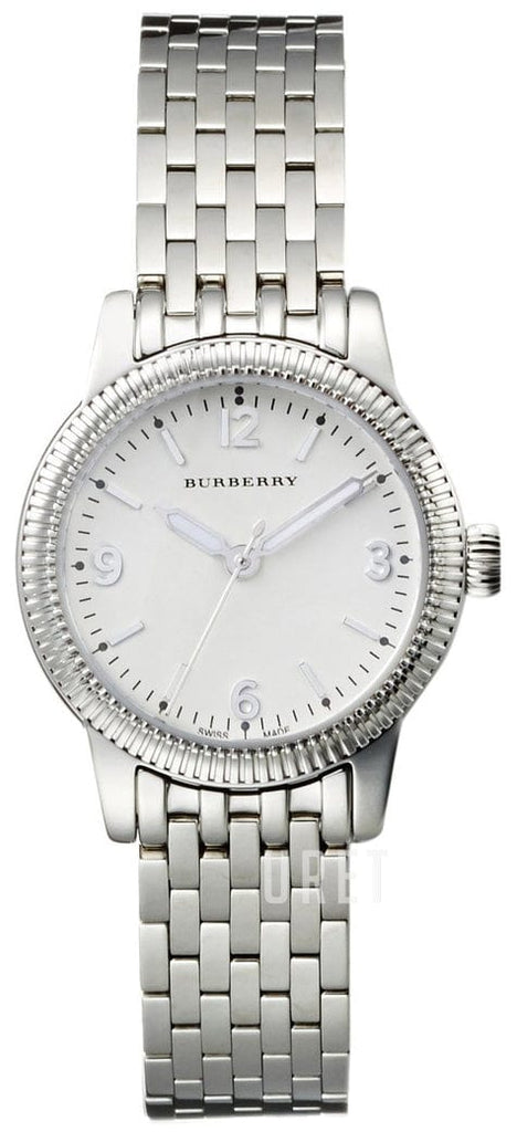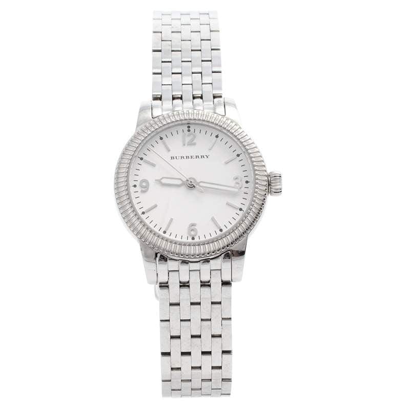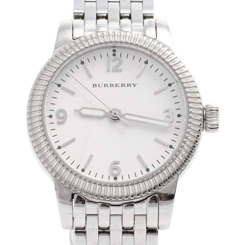 Give your everyday style an upgrade with this exquisite Burberry timepiece. The quartz watch comes expertly crafted using stainless steel. The ridged bezel surrounds a beautiful white dial detailed with stick and Arabic numeral hour markers, three hands, and minute markers around the outer rim. The comfortable bracelet is fastened using a push-button clasp.