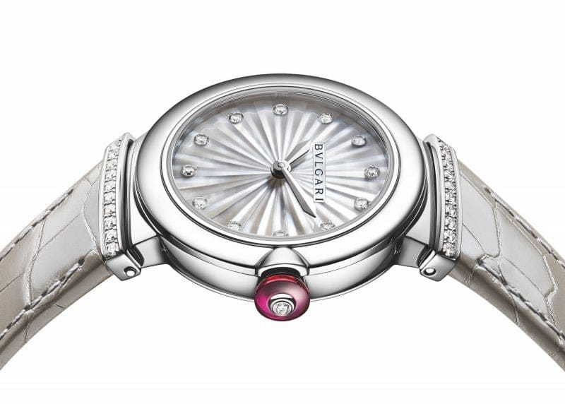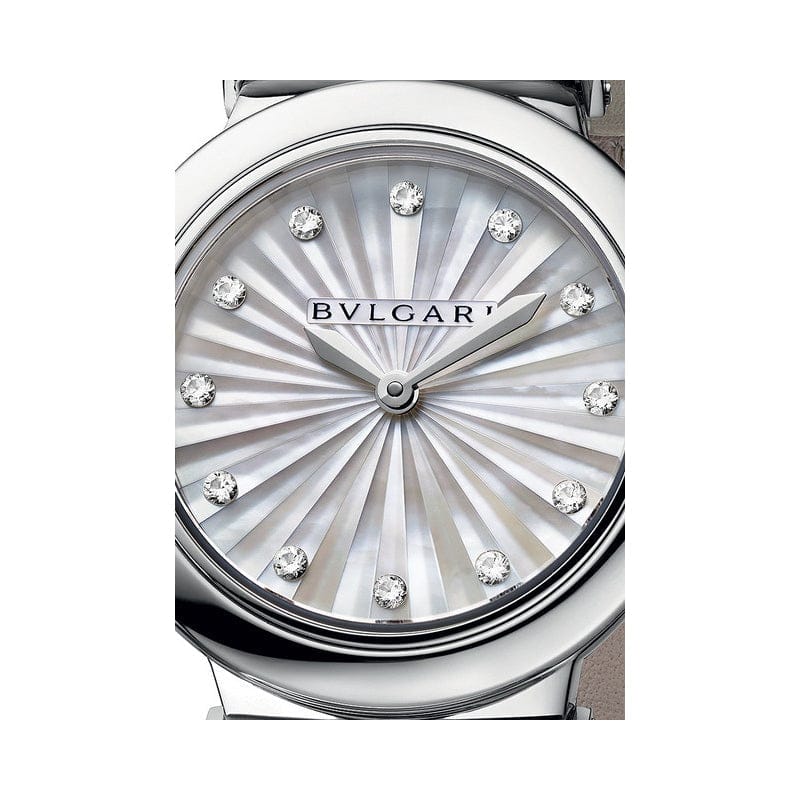 A symbol of radiant and modern femininity, the LVCEA watch brings glamour to the everyday and to every style. Infused with exceptional artistry, this rendition in stainless steel, completed by a grey alligator bracelet, displays the integral bond between Bulgari’s jewellery savoir faire and watchmaking expertise. Its three-dimensional dial, embellished with diamond indexes, is crafted with mother-of-pearl elements, faceted and assembled one by one to evoke the rays of the sun: a classic métiers d’art technique inspired by “intarsia".