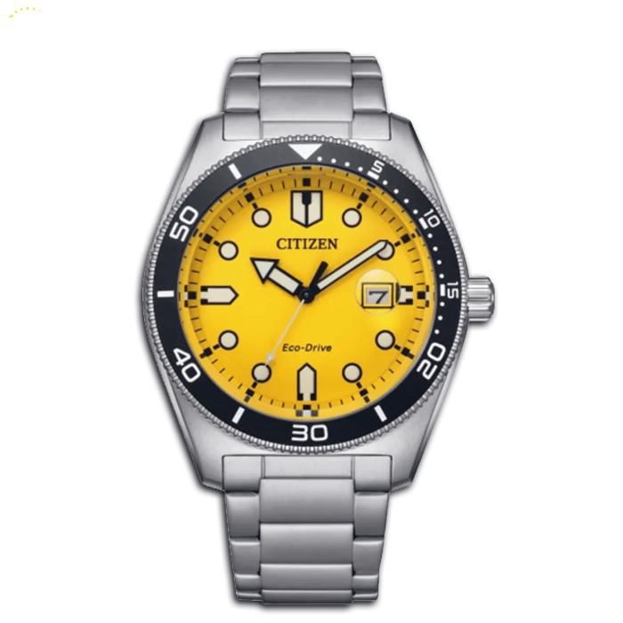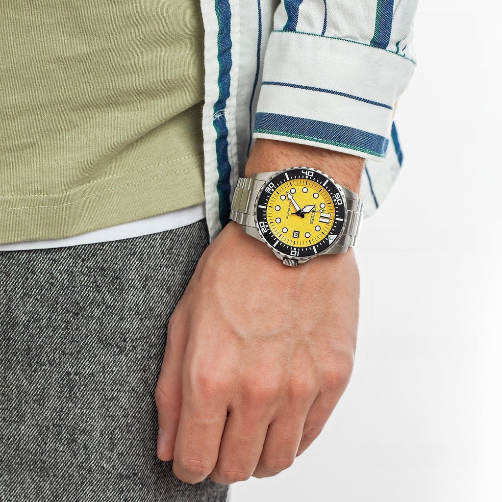 Citizen NJ0170-83Z Metal Band Men Watch. The case is made out of silver stainless steel with a black bezel, which stands for the high quality of the item, it has a yellow color dial. This model has got 100 meters of water resistance. it can be worn in scenarios where it is likely to be splashed but not immersed in water and will be fine in rain. The watch is shipped with an original box