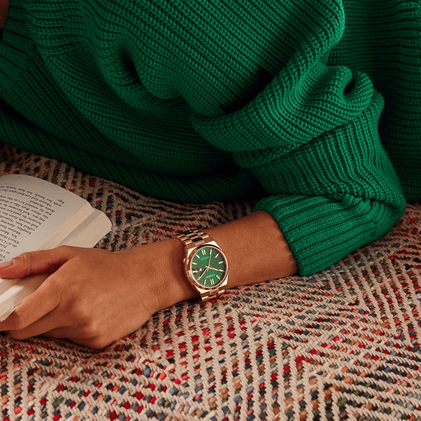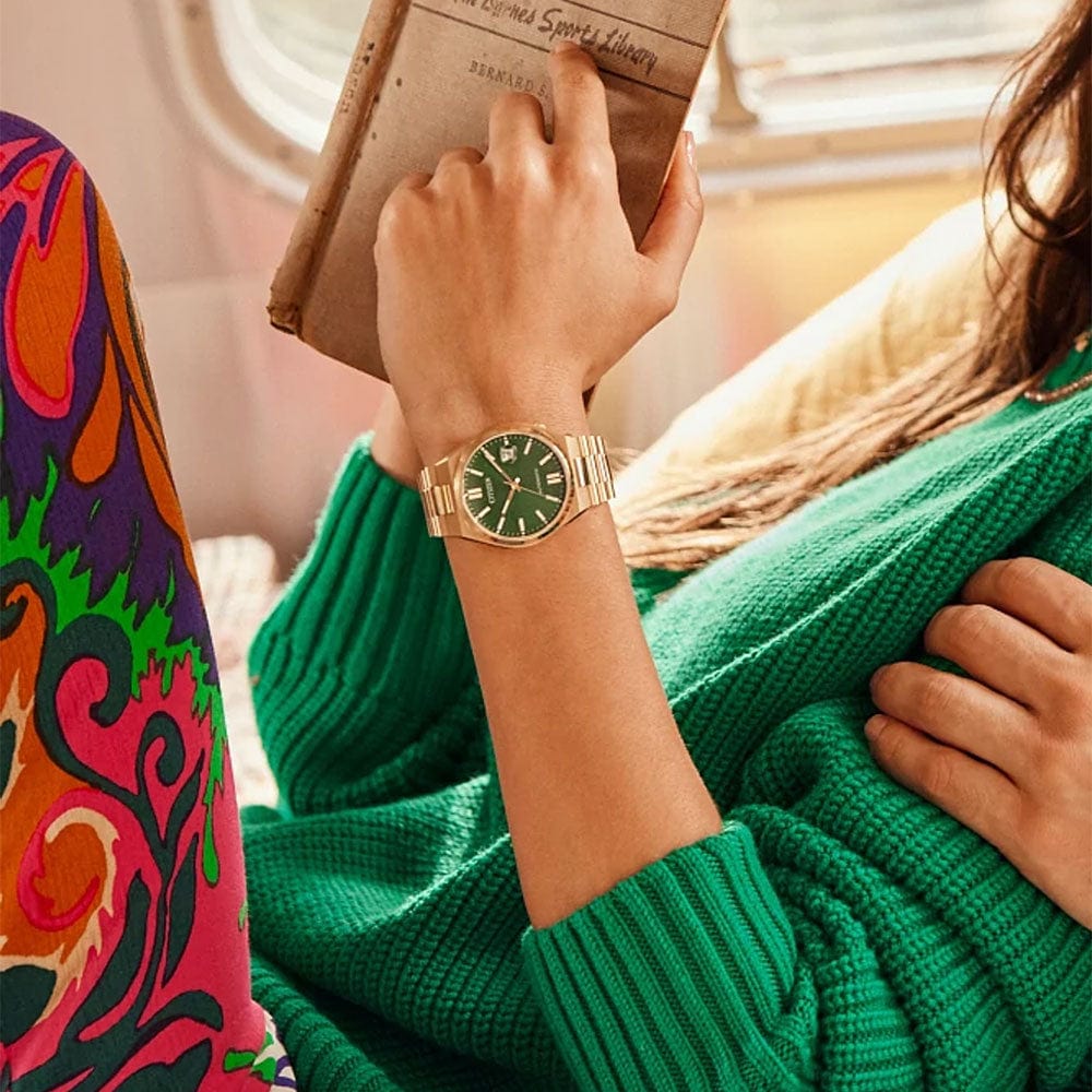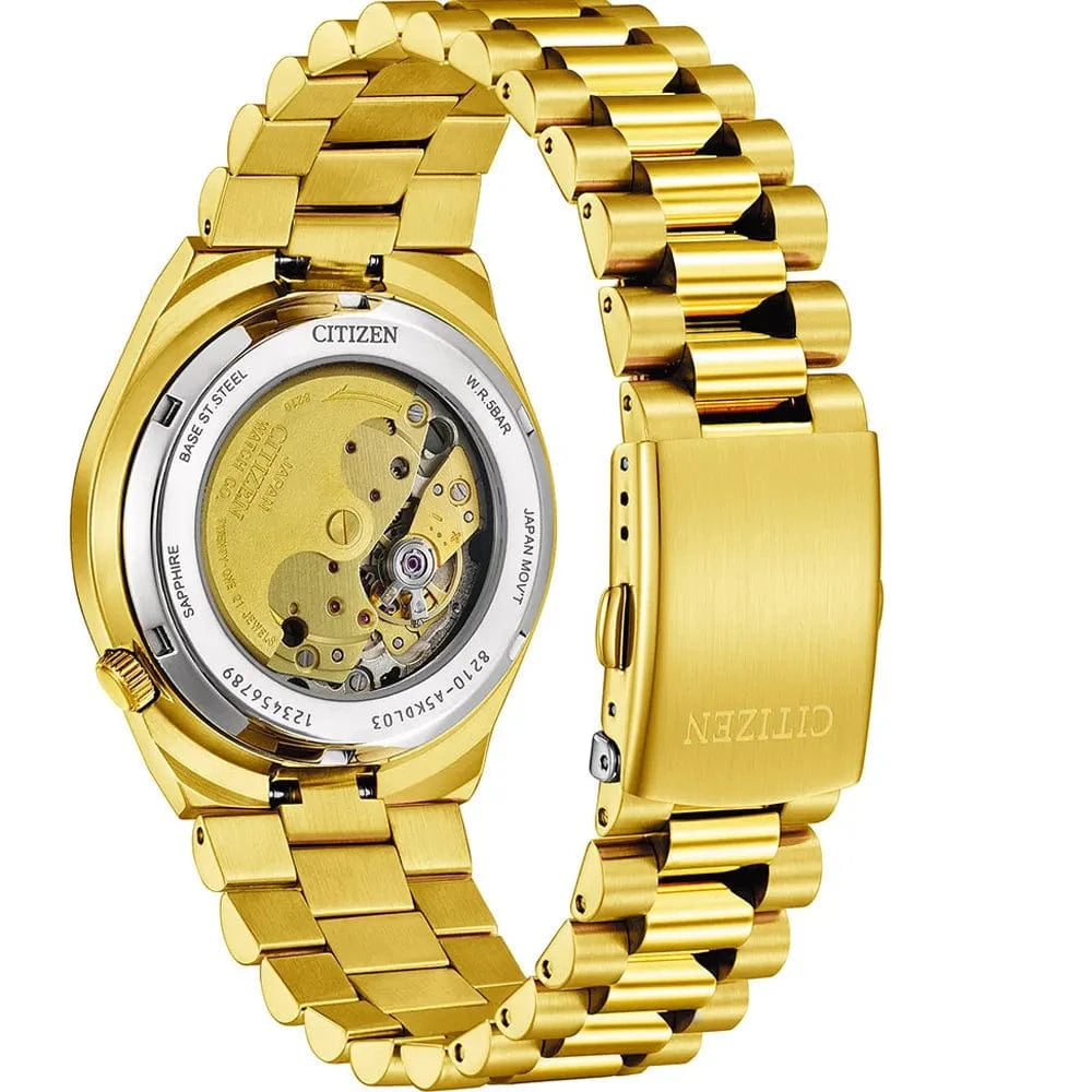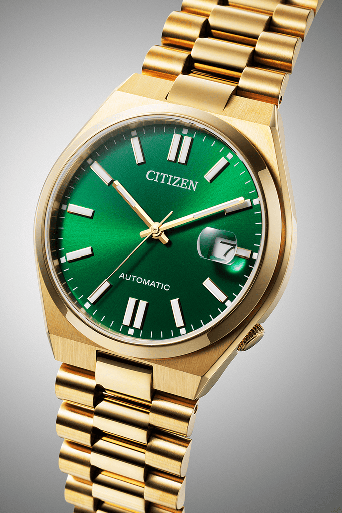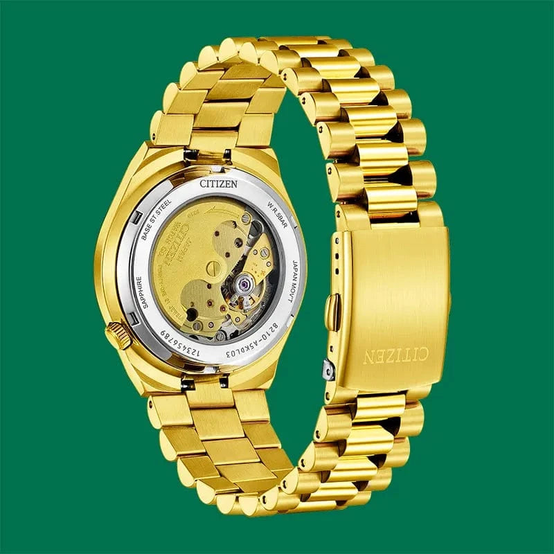 Introducing the new entry to the Tsuyosa collection, a timepiece that merges CITIZEN's esteemed mechanical precision with luxurious design elements. This watch's gold-plated stainless-steel construction radiates the opulence and enduring appeal of gold, offering a striking contrast to the rich green hue of the dial, 40mm in diameter, it provides a robust presence on the wrist that is both noticed and admired.