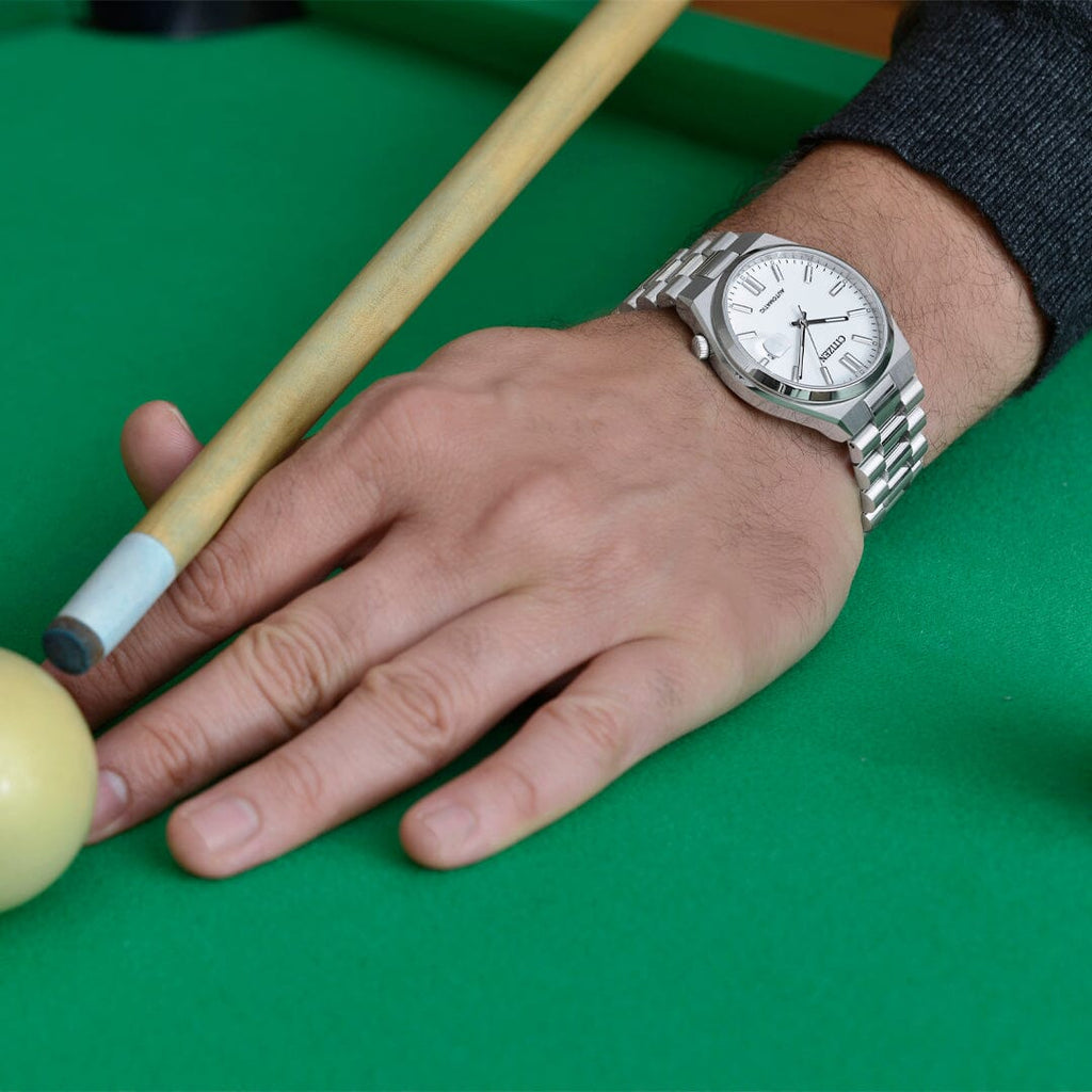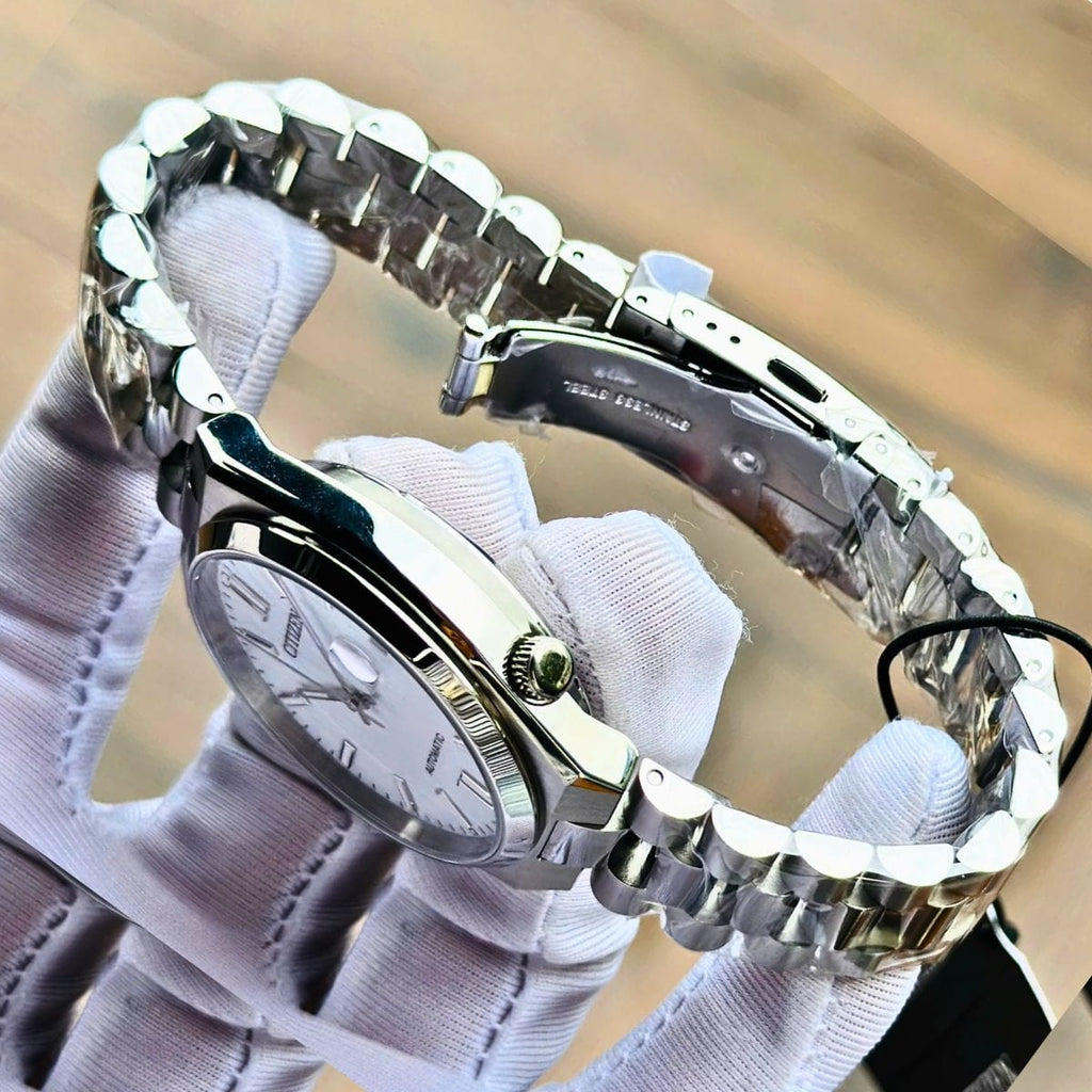 The "Tsuyosa" Automatic, from the Mechanical collection, exudes modern sports style right on your wrist. Its 40mm case and silver-tone stainless steel material make a bold statement. The watch also features an anti-reflective sapphire crystal, a 3 o’clock date window, and striking silver-tone details on its timeless white dial. With an automatic movement and water resistance up to 50 meters, this refined timepiece is perfect for everyday wear, no matter where your day takes you!