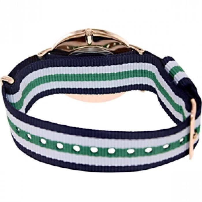 The original Daniel Wellington men's watch 0108DW, from the Nottingham collection, is part of the Casual watch category. The clock mechanism is a quartz one, housed in a round case with an opaque cover. The diameter of the case is 40 mm, and the thickness is 6 mm. The Daniel Wellington 0108DW watch has a nato (nylon) strap and an analog dial, covered by a mineral crystal glass. Water resistant to a depth of 30 m (3 atm), the watch has the following functions: hour, minute.