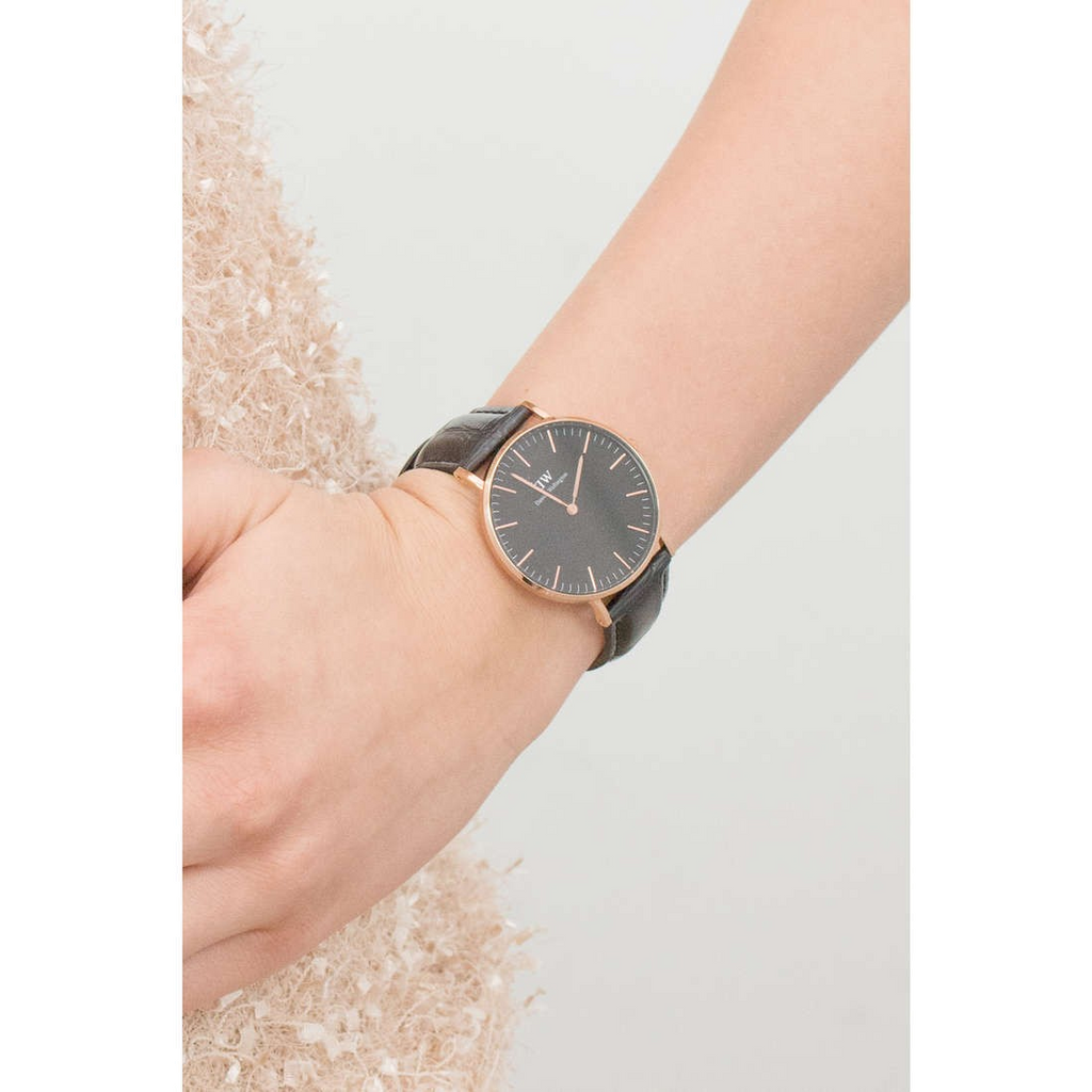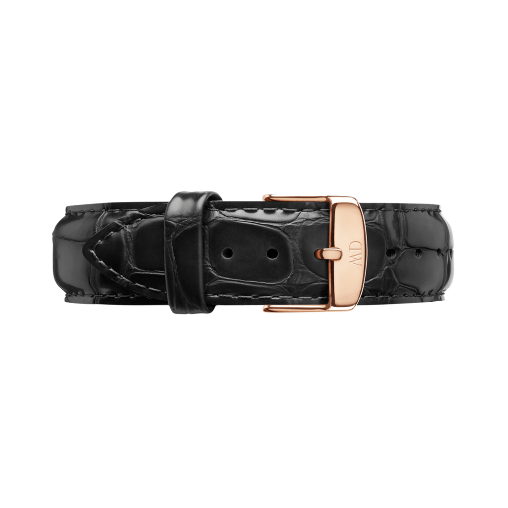 Daniel Wellington women's watch from the Classic Black Reading collection, quartz movement, rosé steel case, black leather strap, black dial, WR 30m. Reference: DW00100141