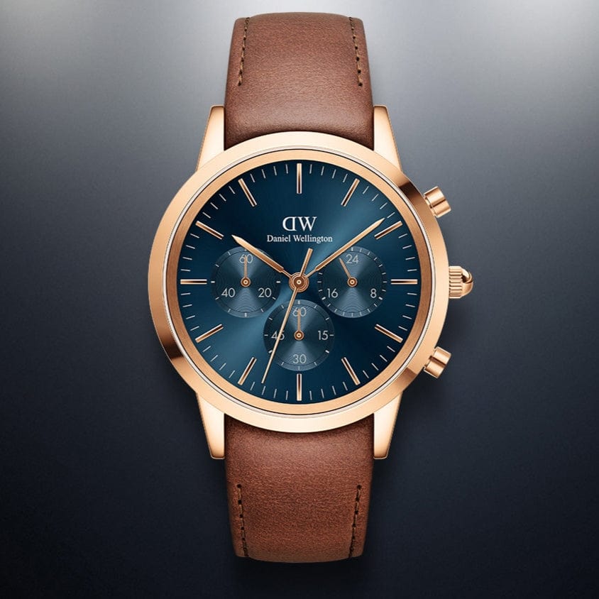 Elevate your style with the Daniel Wellington Iconic Chronograph Blue Dial Brown Leather Strap Watch for men. Featuring a sleek blue dial and a rich brown leather strap, this watch exudes sophistication and elegance. The chronograph function adds practicality to this timeless timepiece. Make a statement with this must-have accessory.