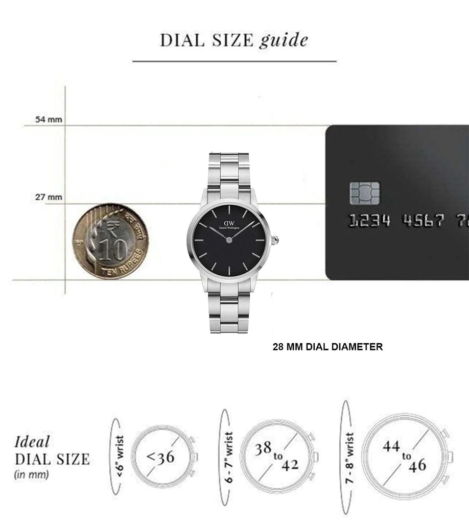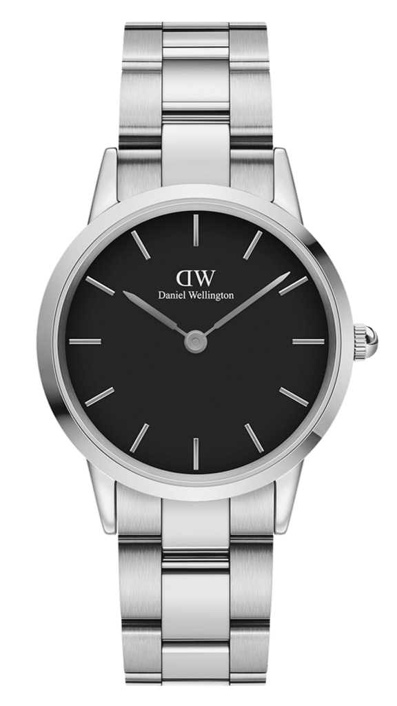 Silver-tone stainless steel case and bracelet. Fixed silver-tone stainless steel bezel. Black dial with silver-tone hands and index hour markers. Dial Type: Analog. Quartz movement. Scratch resistant mineral crystal. Pull / push crown. Solid case back. Round case shape, case size: 36 mm, case thickness: 10 mm. Band width: 14 mm. Butterfly clasp. Water resistant at 30 meters / 100 feet. Functions: hour, minute. Iconic Link Series. Casual watch style. Watch label: Japan Movt. Daniel Wellington Iconic Link Quartz Black Dial Unisex Watch DW00100204.