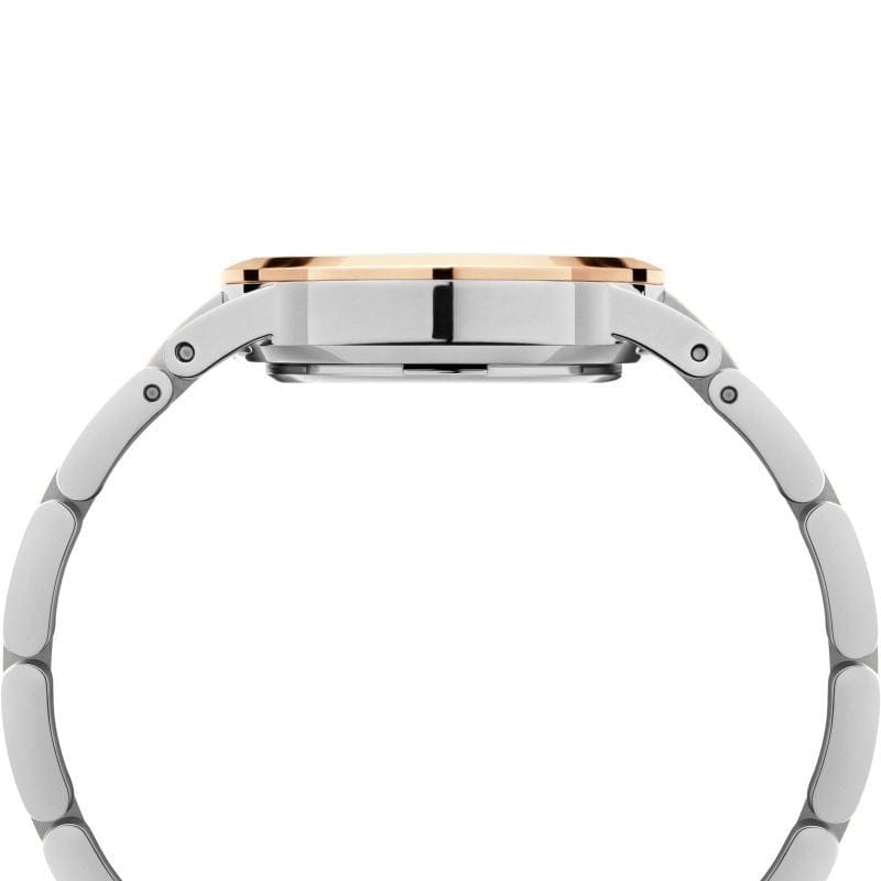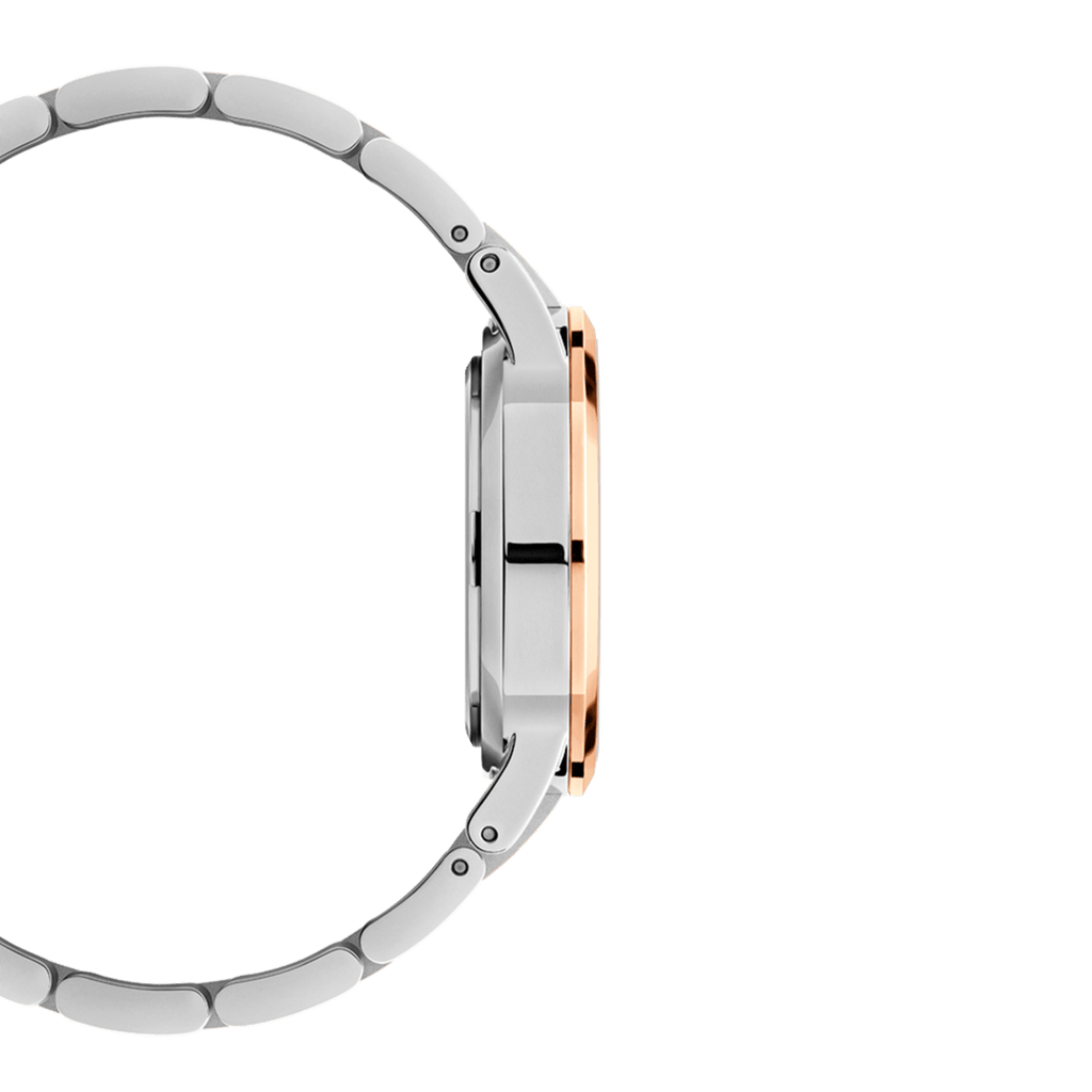 Experience the stunning Lumine, featuring a crystal-studded white eggshell dial and a unique two-tone design that exudes elegance and grace. The polished stainless steel has a brilliant silver finish, while the bracelet and case are beautifully bathed in rose gold. Make a statement with this timepiece's bright new silhouette and captivating combination of colors.