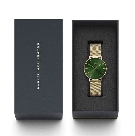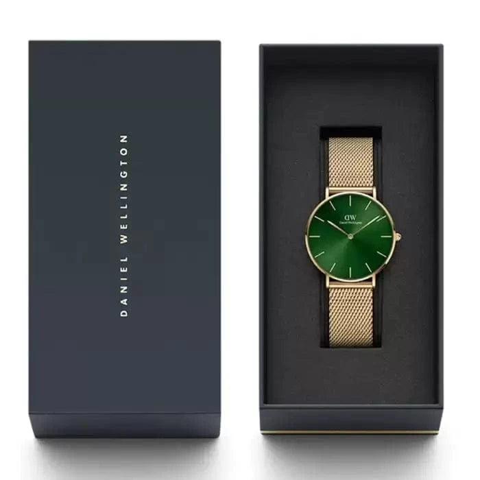 Elevate your style with Daniel Wellington's Petite Emerald Green Dial Gold Mesh Strap Watch. This watch combines timeless elegance with modern design, featuring an eye-catching emerald green dial and a sleek gold mesh strap. Make a statement and stay on trend with this must-have accessory.