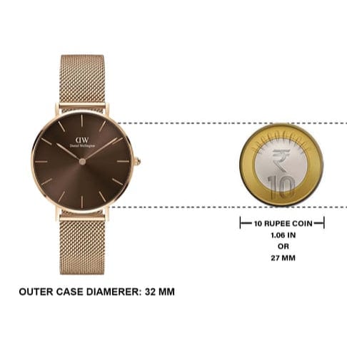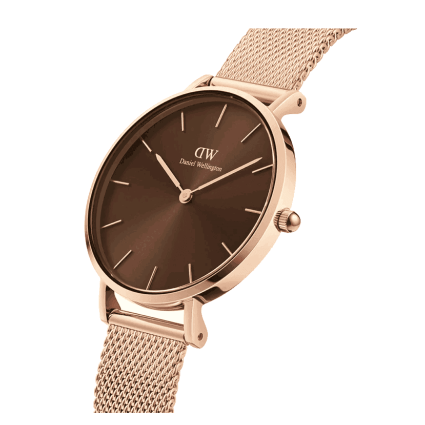 This Daniel Wellington watch boasts a sleek and modern design with a brown dial and stylish rose gold mesh strap. With its petite size, it is perfect for women looking for a sophisticated timepiece. Complete your look with this elegant and versatile accessory.