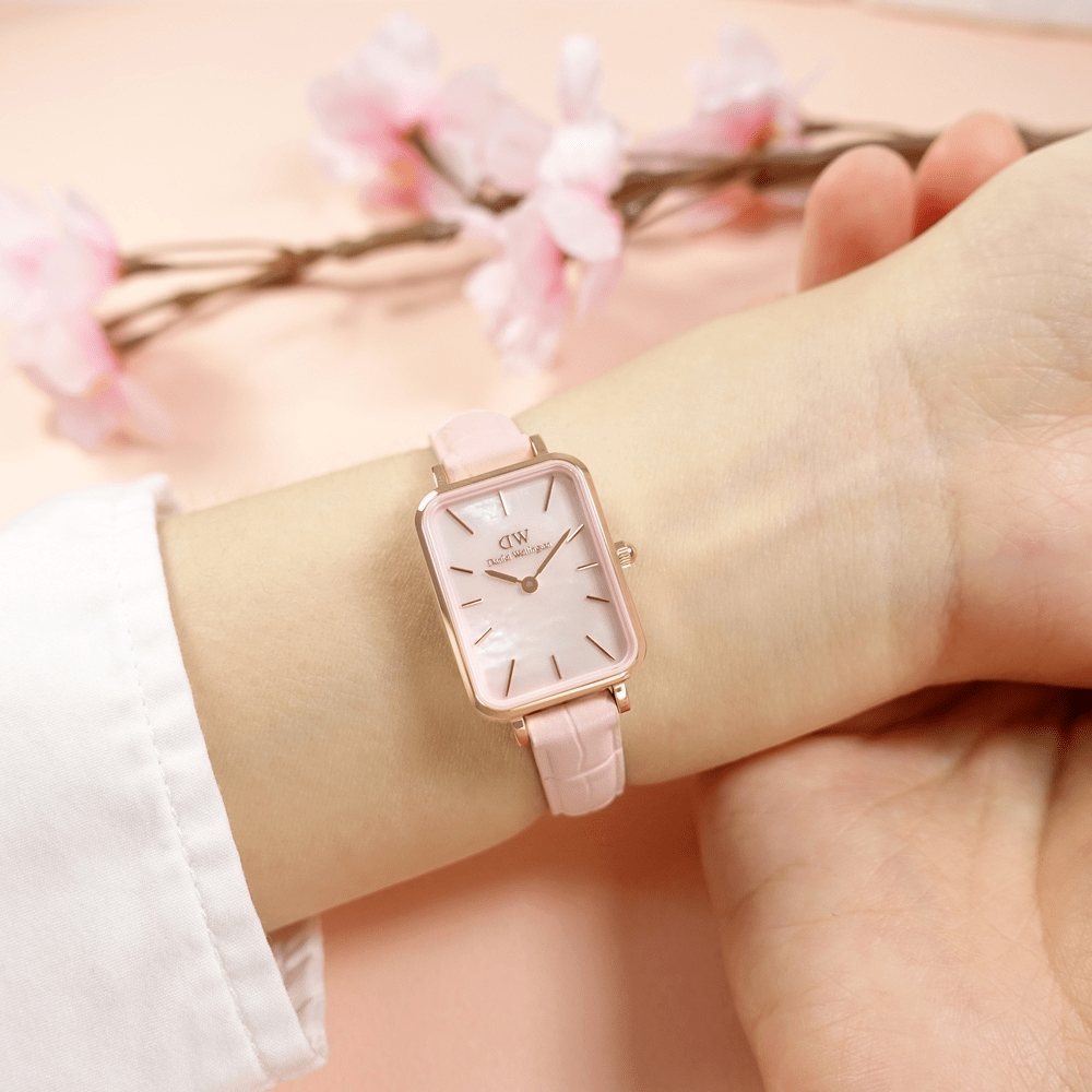 Daniel Wellington Quadro Pressed Mother of Pearl Pink Dial Pink Leather Strap Watch For Women - DW00100508
