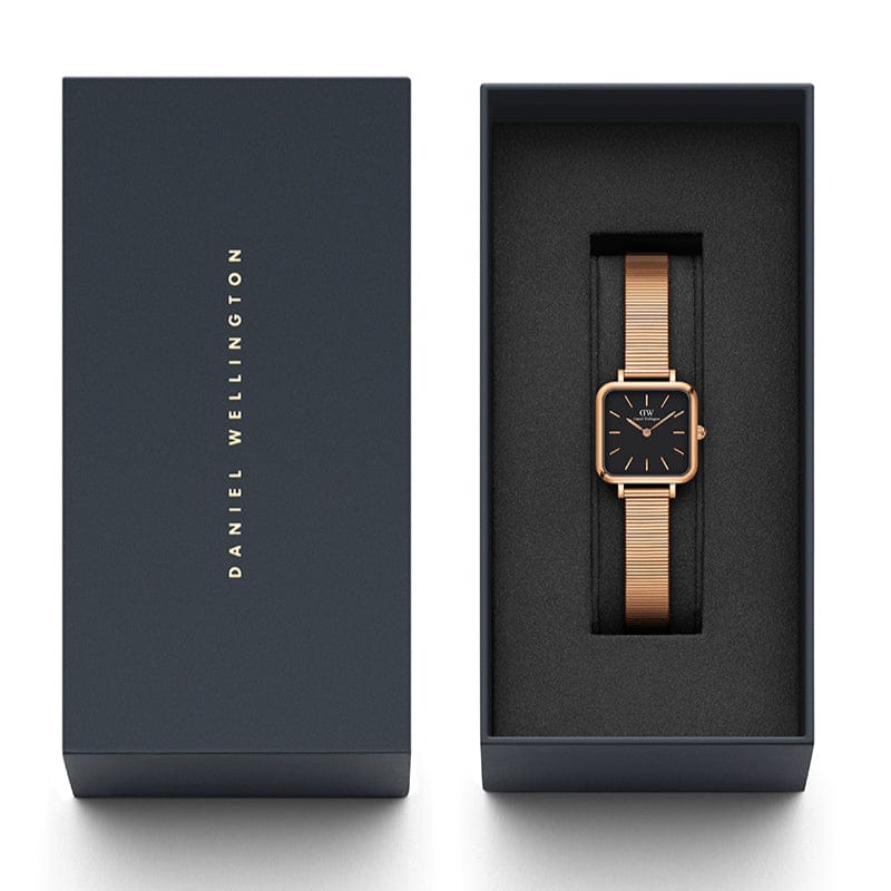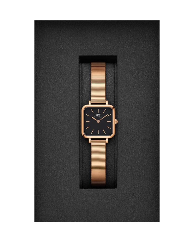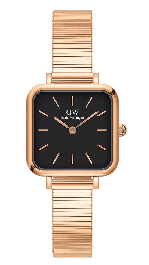 Elevate your style with the Daniel Wellington Quadro Studio Watch. Featuring a sleek black dial and luxurious rose gold mesh strap, this watch is the perfect blend of elegance and sophistication. With its high-quality craftsmanship and timeless design, it's a must-have accessory for any fashion-forward woman.