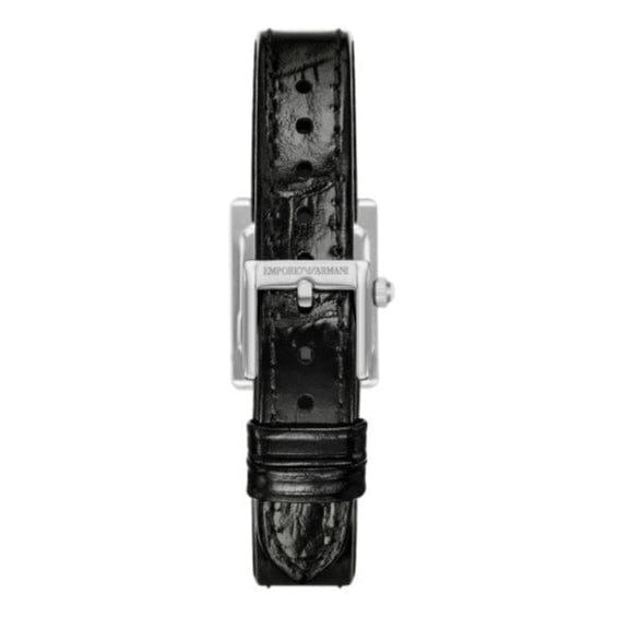 The Emporio Armani AR11660 women's watch combines classic elegance with modern design, making it a stylish companion for any occasion. Its rectangular stainless steel case exudes refinement, while the sparkling stones on the bezel add a touch of luxury. The silver-colored dial with black Roman numerals ensures clear readability and emphasizes the timeless appeal of this model. Complementing the design is a classic black leather strap, which not only feels comfortable on the wrist but also creates a striking contrast with the sophisticated case.