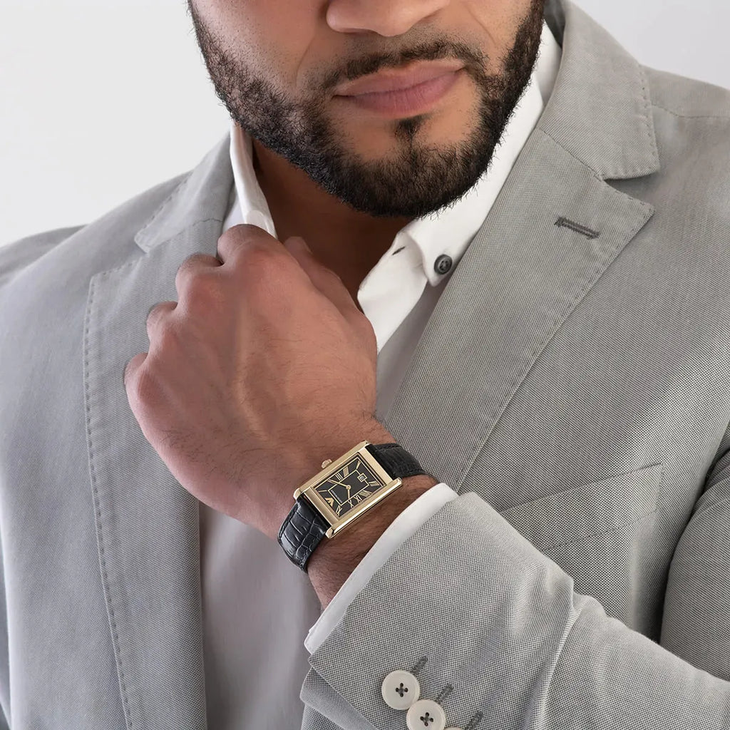 - This model exhibits a rectangular black dial with a date aperture at 6 o'clock.