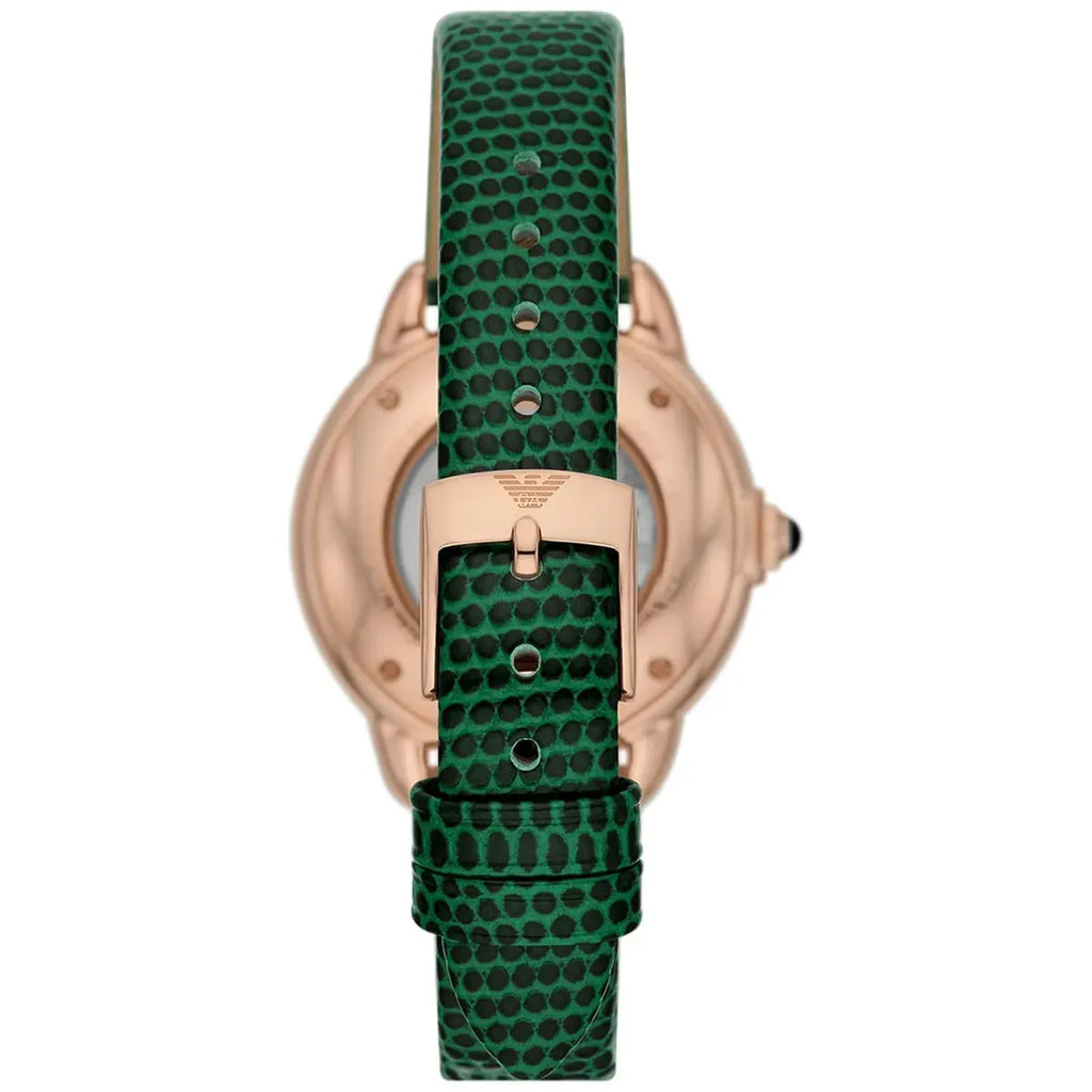 The Emporio Armani AR60073 Mia Automatic combines elegance with mechanical precision, featuring a rose gold tone stainless steel case paired with a vibrant green leather strap. Its green patterned dial, accented with rose gold details, exudes a sophisticated charm that catches the eye. Powered by an automatic movement, this timepiece offers both aesthetic appeal and reliable functionality without needing a battery. With a refined 34mm case size and a comfortable 14mm band width, it provides a balanced presence on the wrist. Designed for versatility, it includes 50 meters water resistance, making it suitable for everyday wear and occasional water exposure while maintaining its stylish allure.