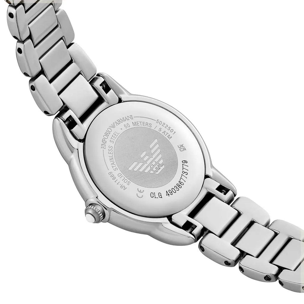 - Emporio Armani's 26mm petite stainless steel watch showcases a glossy white mother-of-pearl dial in a round case with a two-hand quartz movement. The sleek stainless steel bracelet makes this a beautiful addition to an ensemble for any occasion.