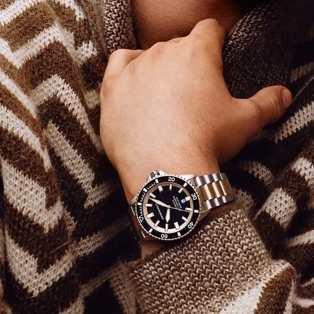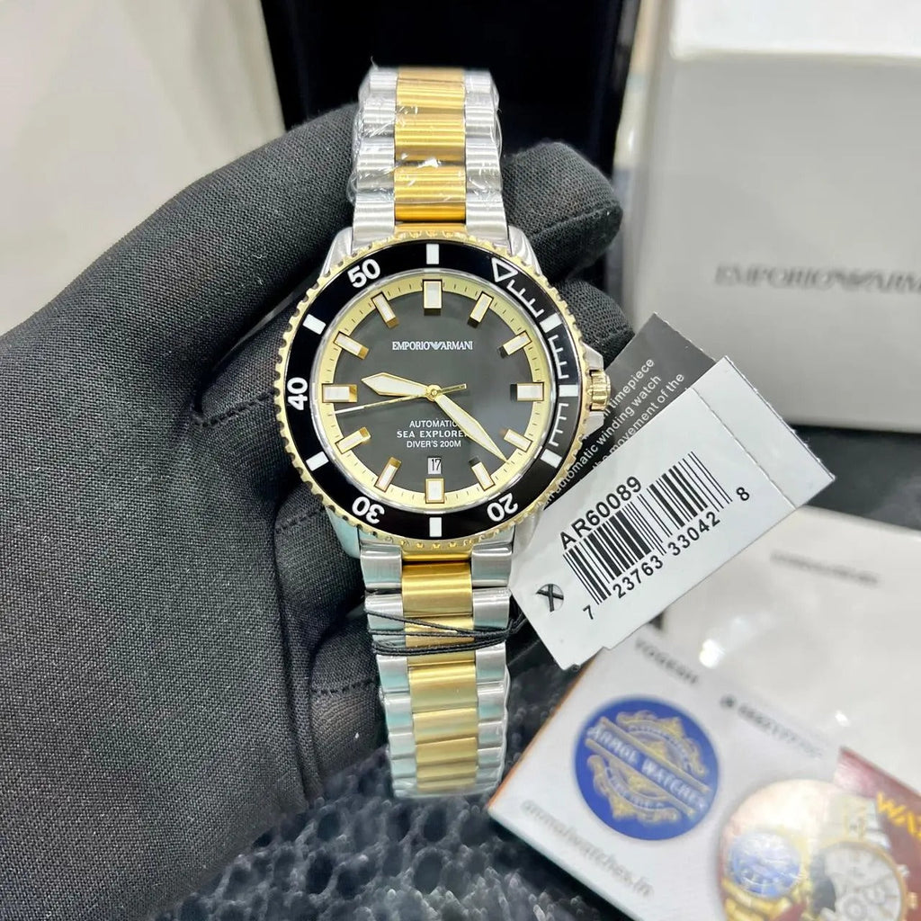 - Emporio Armani's Sea Explorer is a 42.5mm automatic dive watch featuring sapphire crystal and Super-LumiNova on hands, indexes and bezel markings for optimal visibility in dark underwater conditions. As indicated by the "Diver's" marking on the dial, this watch is ISO 6425 certified, making it expertly equipped for deep-sea diving up to 200 meters. This iteration boasts a glossy black enamel dial and an integrated two-tone stainless steel bracelet.
