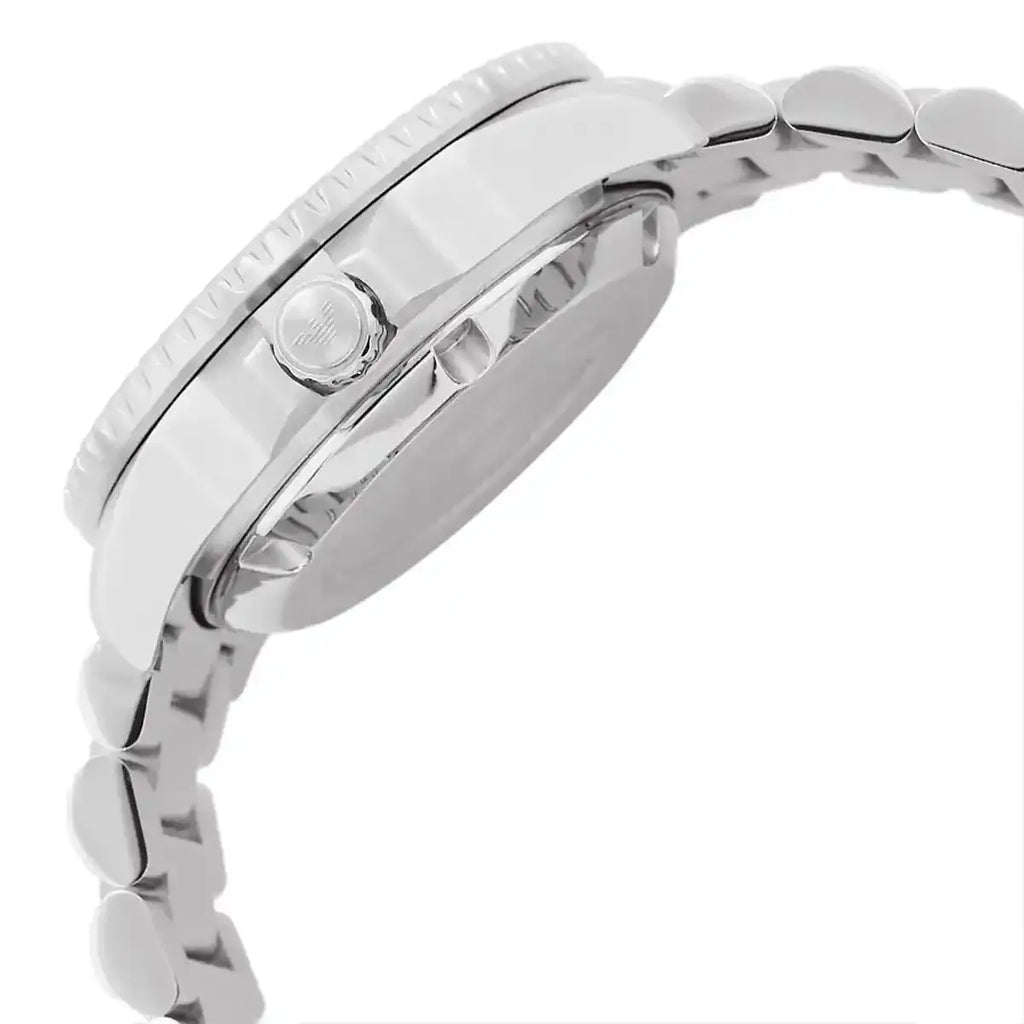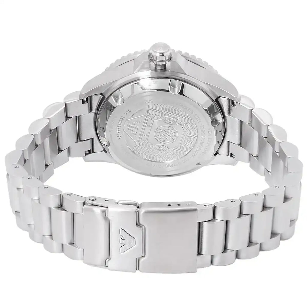 Emporio Armani's 42.5mm Sea Explorer watch features a glossy blue enamel dial, blue aluminium bezel insert, Super-LumiNova® on hands, indexes and bezel markings, sapphire crystal, automatic movement, 20 ATM, a screwed crown and stainless steel bracelet. ISO Certification.