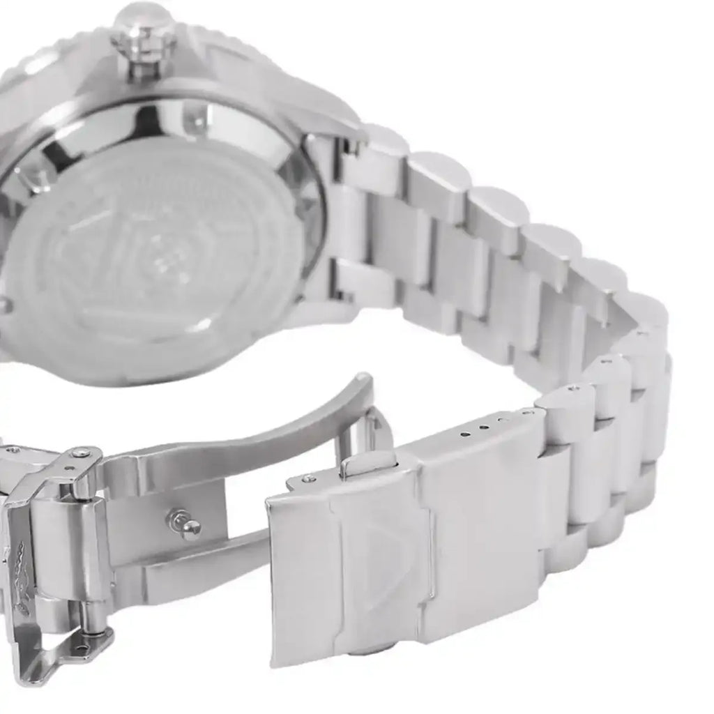 Sea Explorer is a 42.5mm automatic dive watch featuring sapphire crystal and Super-LumiNova® on hands, indexes and bezel markings for optimal visibility in dark underwater conditions. As indicated by the "Diver's" marking on the dial, this watch is ISO 6425 certified, making it expertly equipped for deep-sea diving up to 200 meters. This iteration boasts a glossy blue enamel dial and an integrated stainless steel bracelet.