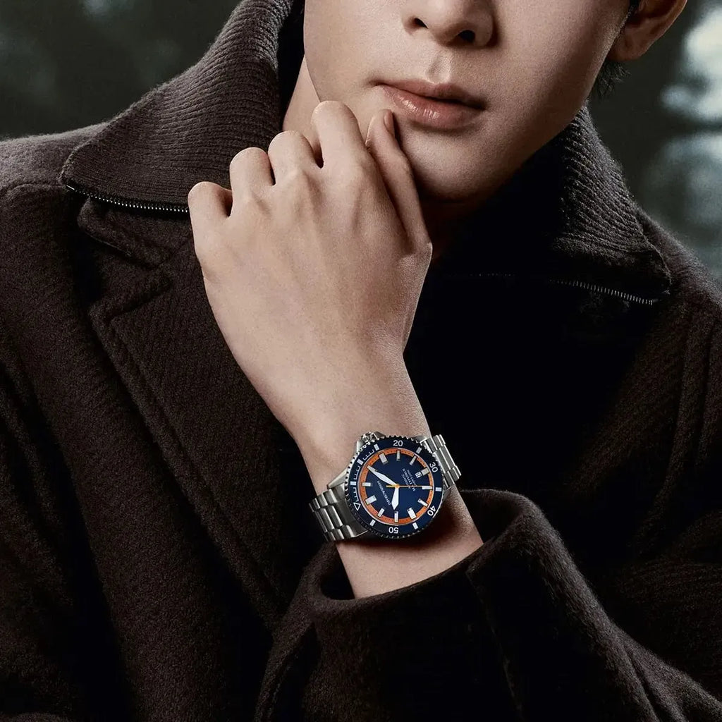 Sea Explorer is a 42.5mm automatic dive watch featuring sapphire crystal and Super-LumiNova® on hands, indexes and bezel markings for optimal visibility in dark underwater conditions. As indicated by the "Diver's" marking on the dial, this watch is ISO 6425 certified, making it expertly equipped for deep-sea diving up to 200 meters. This iteration boasts a glossy blue enamel dial with orange accents and an integrated stainless steel bracelet.