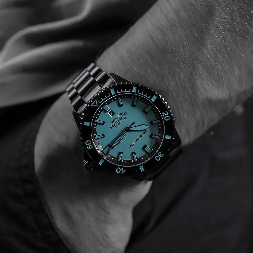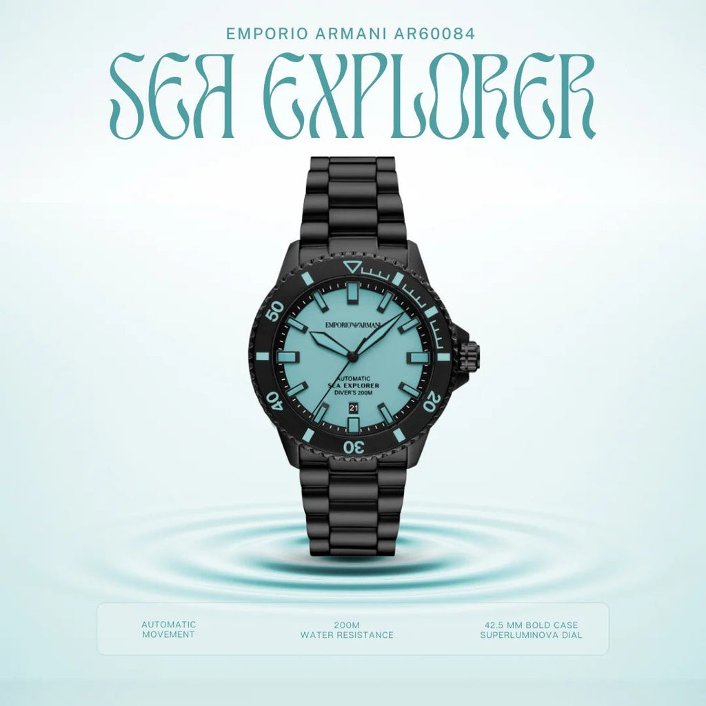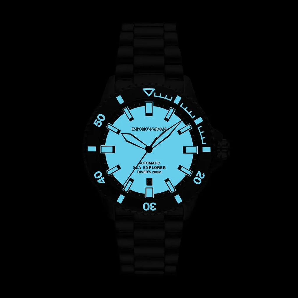 Emporio Armani's Sea Explorer is a 42.5mm watch with a blue Super-LumiNova® dial, as well as hands, indexes and bezel markings, for optimal visibility in dark underwater conditions. The Sea Explorer features an automatic three-hand date movement, sapphire crystal, a screw-down crown, and a plated black stainless steel bracelet. The "Diver's" marking on the dial asserts that this is an ISO 6425 Certified watch with 20 ATM water resistance.
