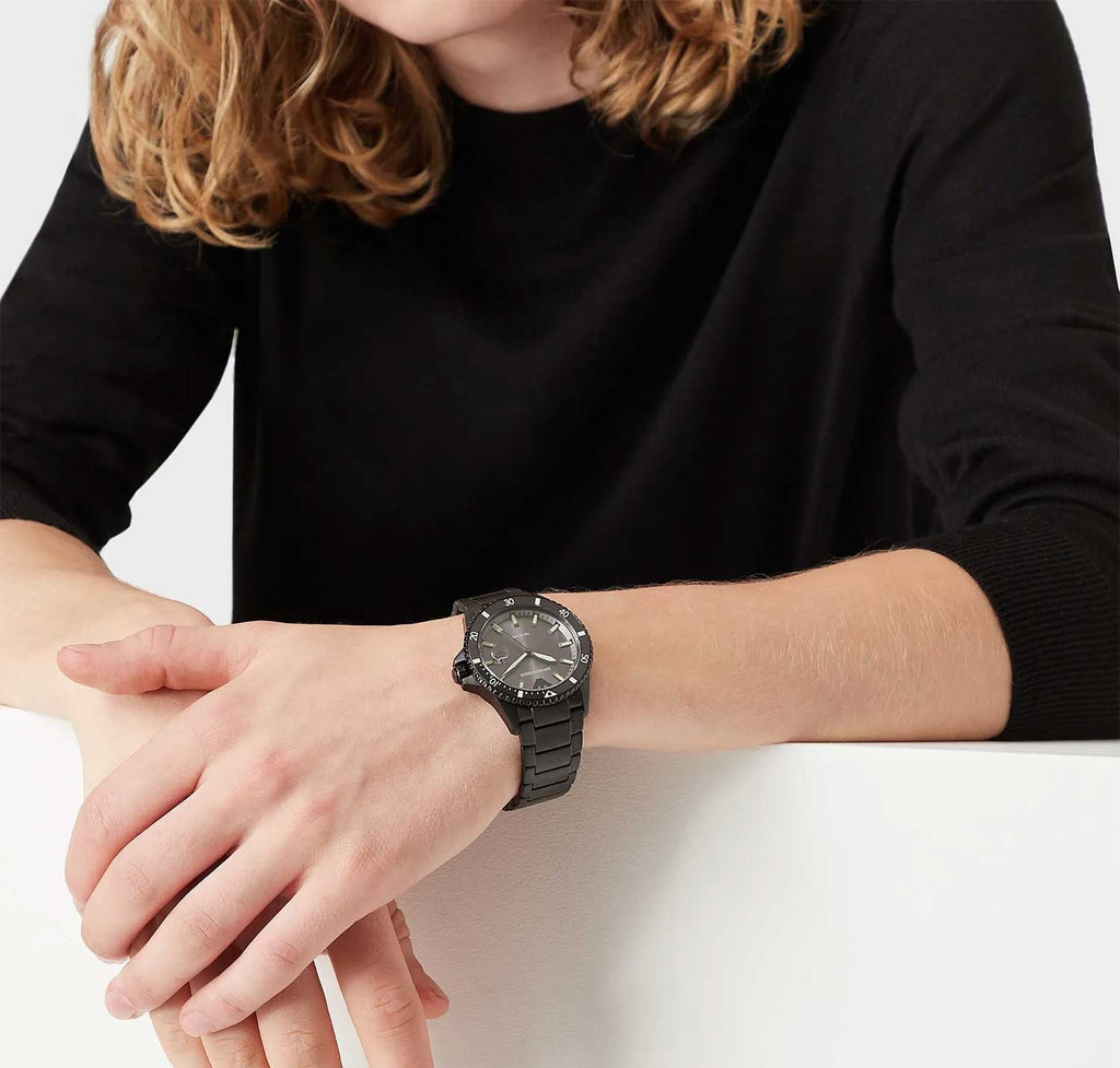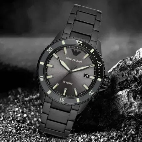 Emporio Armani AR11398 is an amazing and attractive Gents watch. Material of the case is Stainless Steel and the Grey dial gives the watch that unique look. 100 metres water resistancy will protect the watch and allows it to get submerged in the water for everyday usage including swimming, but not high impact water sports.