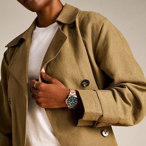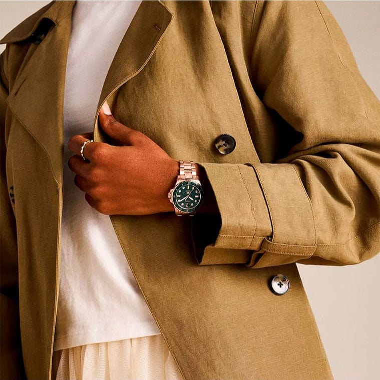 Experience the ultimate blend of style and functionality with the Fossil Blue Dive Three Hand Green Dial Rose Gold Steel Strap Watch for Women - ES5371. Featuring a vibrant green dial and a sleek rose gold steel strap, this watch is perfect for any occasion. Stay on time and in style with Fossil Blue.