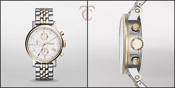 Quartz movement. Scratch resistant mineral crystal. Solid case back. Case diameter: 38 mm. Case thickness: 12 mm. Round case shape. Band width: 18 mm. Deployment clasp. Water resistant at 50 meters / 165 feet. Functions: chronograph, date, hour, minute, second. Casual watch style. Fossil Original Boyfriend Chronograph White Dial Two-tone Watch ES3746.