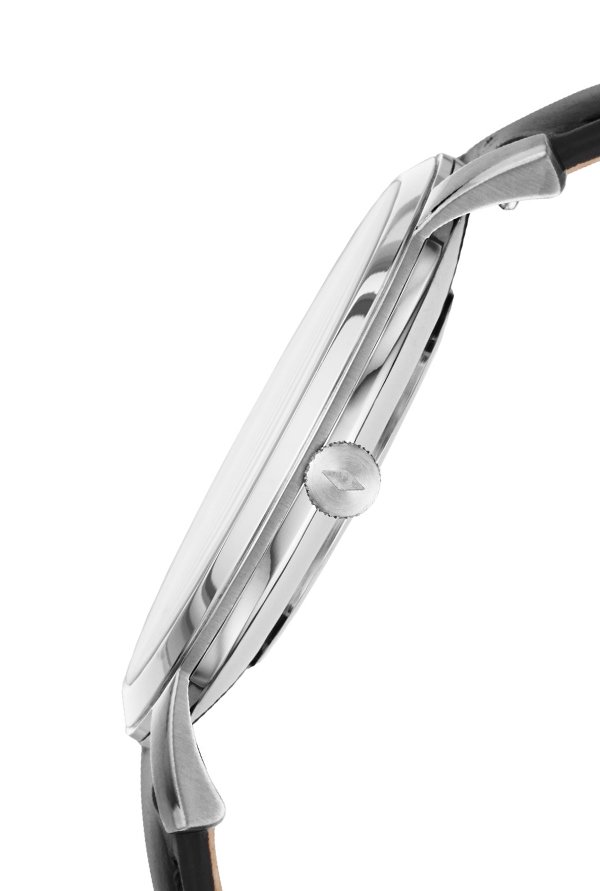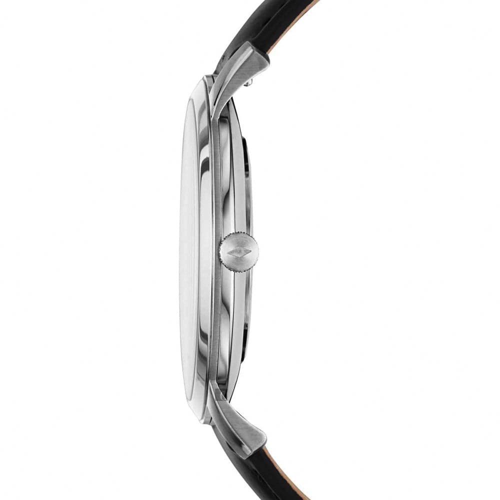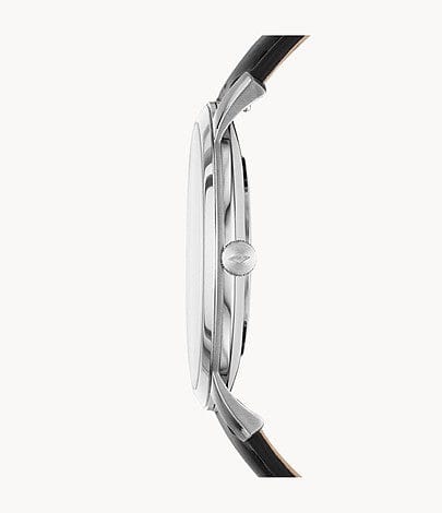 This 44 mm Minimalist features a black satin dial with a genuine diamond at the 12-hour marker, three-hand movement and a black leather strap.