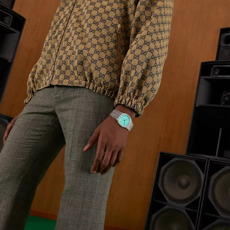 The GUCCI 25H's streamlined silhouette was inspired by the sleek forms of contemporary architecture. The watch is presented with a thin multi-layer case and five-link steel bracelet, while the design is completed by ocean blue glass and an Interlocking G motif. The name, GUCCI 25H, is attributed to a particularly symbolic talisman for Creative Director Alessandro Michele.