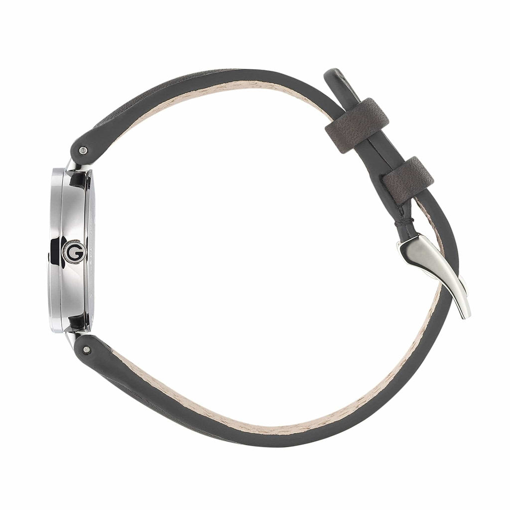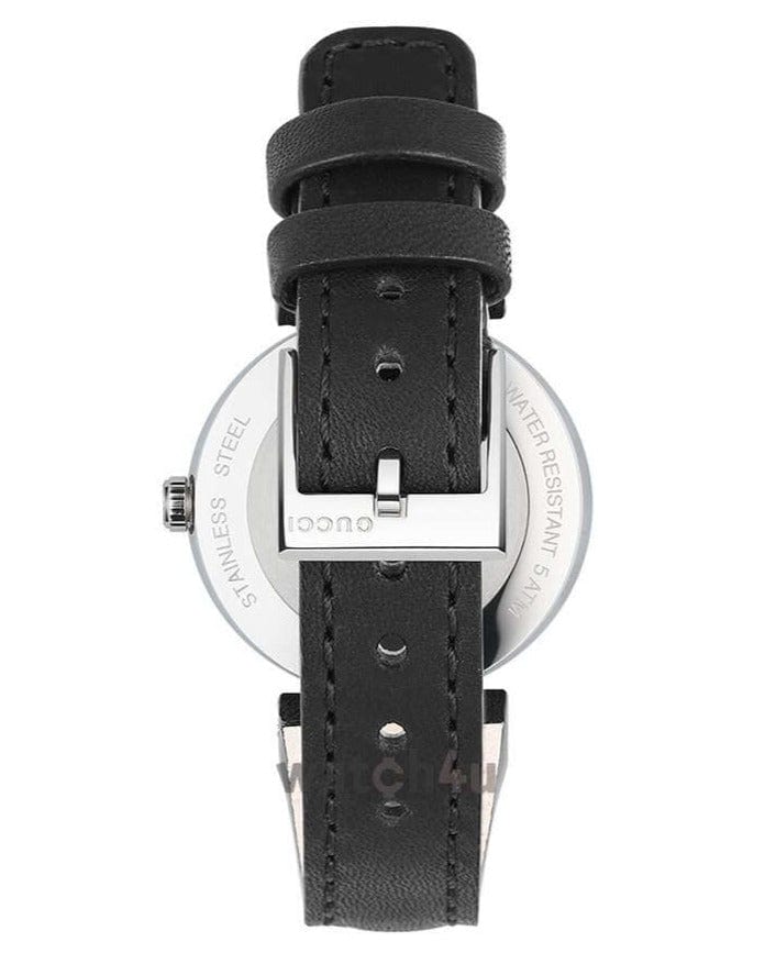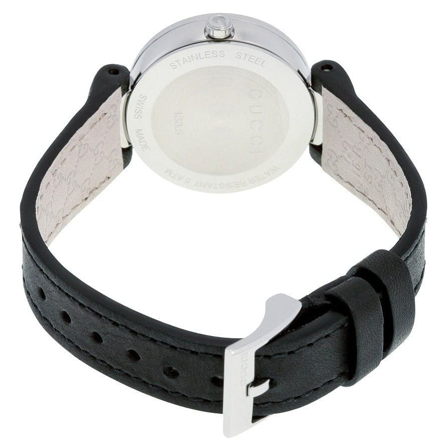 Stainless steel case with a black leather strap. Fixed stainless steel interlocking G bezel. Black dial with silver-tone hands. No markers. The Gucci name appears below the 12 o'clock position.. Dial Type: Analog. Quartz movement. Scratch resistant sapphire crystal. Pull / push crown. Solid case back. Case diameter: 29 mm.Case thickness: 6 mm. Round case shape. Band width: 20 mm. Tang clasp. Water resistant at 50 meters / 165 feet. Functions: hour, minute. Dress watch style. Watch label: Swiss Made. Gucci Interlocking G Black Dial Black Leather Strap Ladies Watch YA133501.