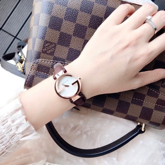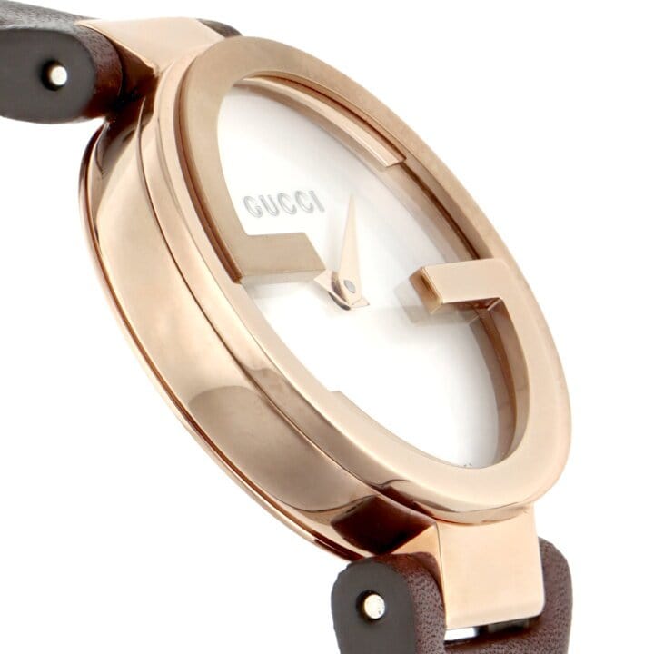 Scratch resistant sapphire crystal. Solid case back. Case size: 29 mm. Case thickness: 8 mm. Round case shape. Band width: 12 mm. Tang clasp. Water resistant at 50 meters / 165 feet. Functions: hour, minute. Dress watch style. Gucci Interlocking Ladies Brown Leather Strap Watch YA133516.