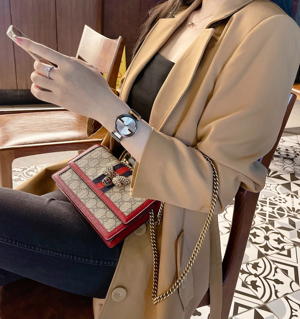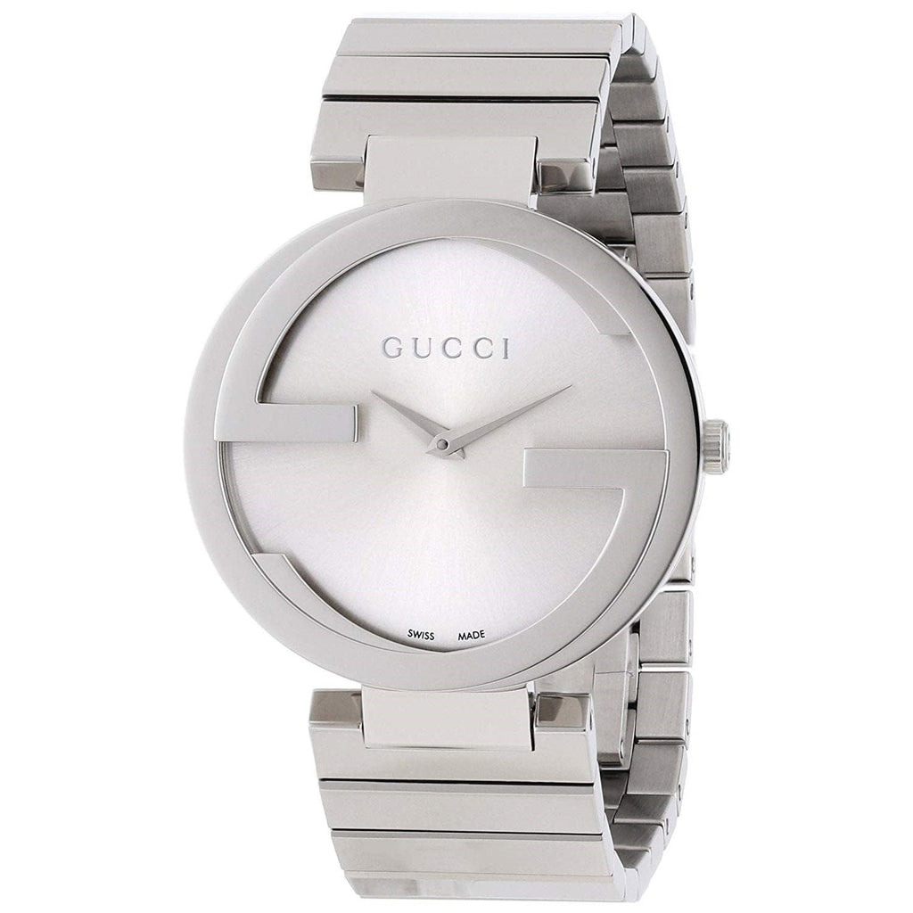 Solid case back. Case diameter: 37 mm. Case thickness: 8 mm. Round case shape. Deployment with push button clasp. Water resistant at 50 meters / 165 feet. Functions: hour, minute. Dress watch style. Watch label: Swiss Made. Gucci Interlocking Silver Dial Stainless Steel Ladies Watch YA133308.