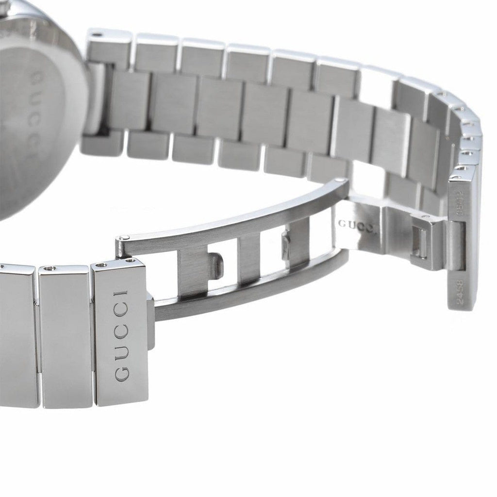 Stainless steel case with a stainless steel bracelet. Fixed stainless steel interlocking 'G' bezel. Silver sun-brushed dial with silver-tone hands. No markers. The Gucci name appears below the 12 o'clock position. Dial Type: Analog. Quartz movement. Scratch resistant sapphire crystal. Pull / push crown.