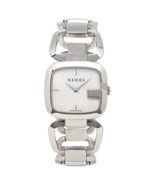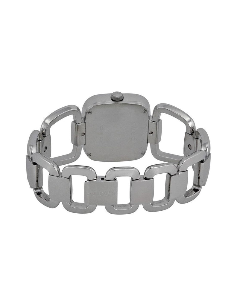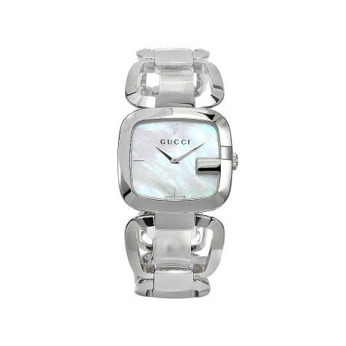 Stainless steel case with a stainless steel bracelet. Fixed G-shaped stainless steel bezel. Mother of pearl dial with silver-tone hands. Index markers at the 6, 9 and 12 o'clock positions. Dial Type: Analog. Quartz movement. Scratch resistant sapphire crystal. Solid case back. Case size: 32 mm. Case thickness: 8 mm. Square case shape. Band width: 28 mm. Jewelry clasp. Water resistant at 30 meters / 100 feet. Functions: hour, minute, bangle. Dress watch style. Watch label: Swiss Made. Gucci G Gucci Mother of Pearl Dial Ladies Watch YA125404.