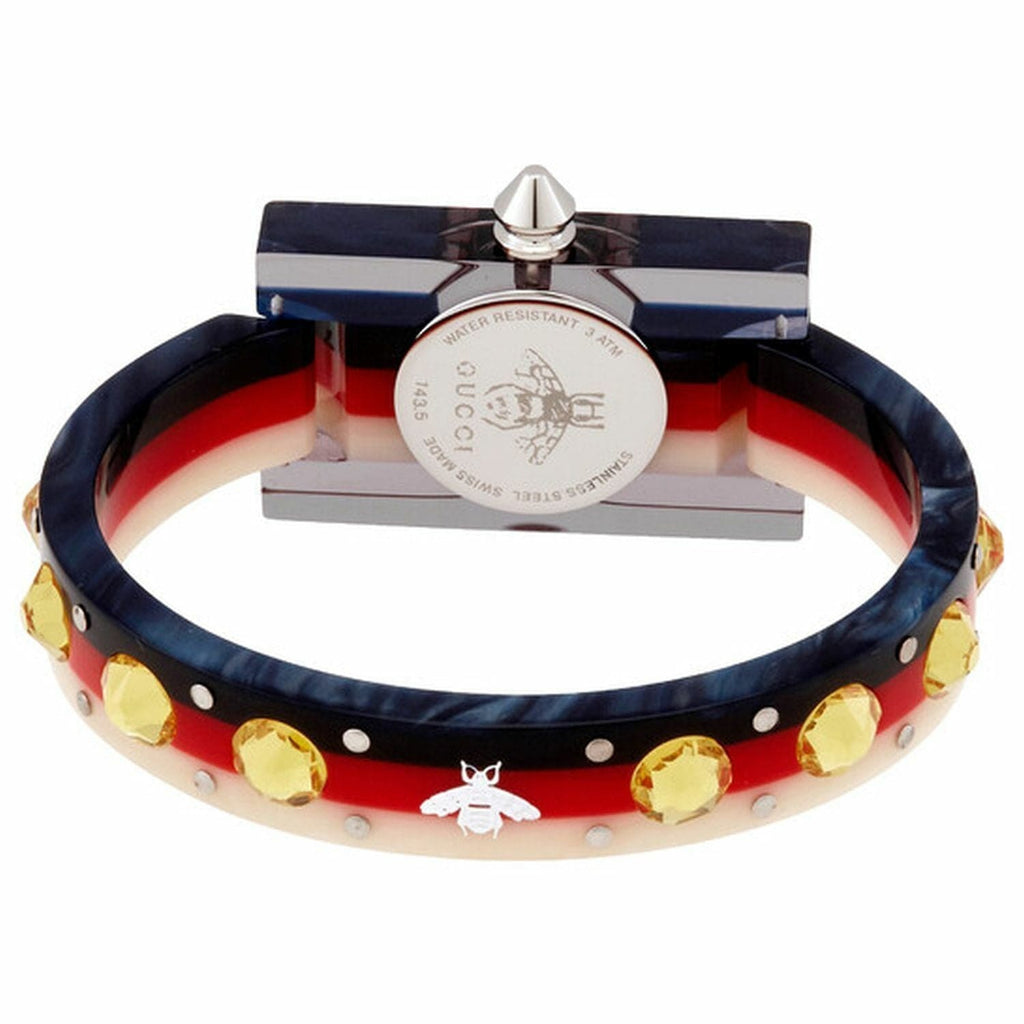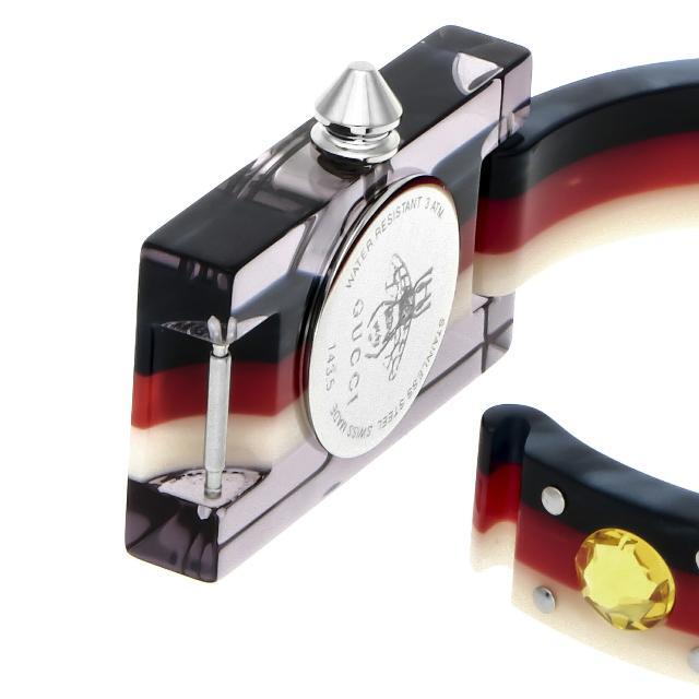 Gucci Vintage Web 24mm x 40mm Resin case on a Resin Strap with No clasp, Mother of Pearl dial with No Hour Markers with Sapphire crystal, Solid case back and water resistant to 30m. This fine timepiece ships with a Gucci bo