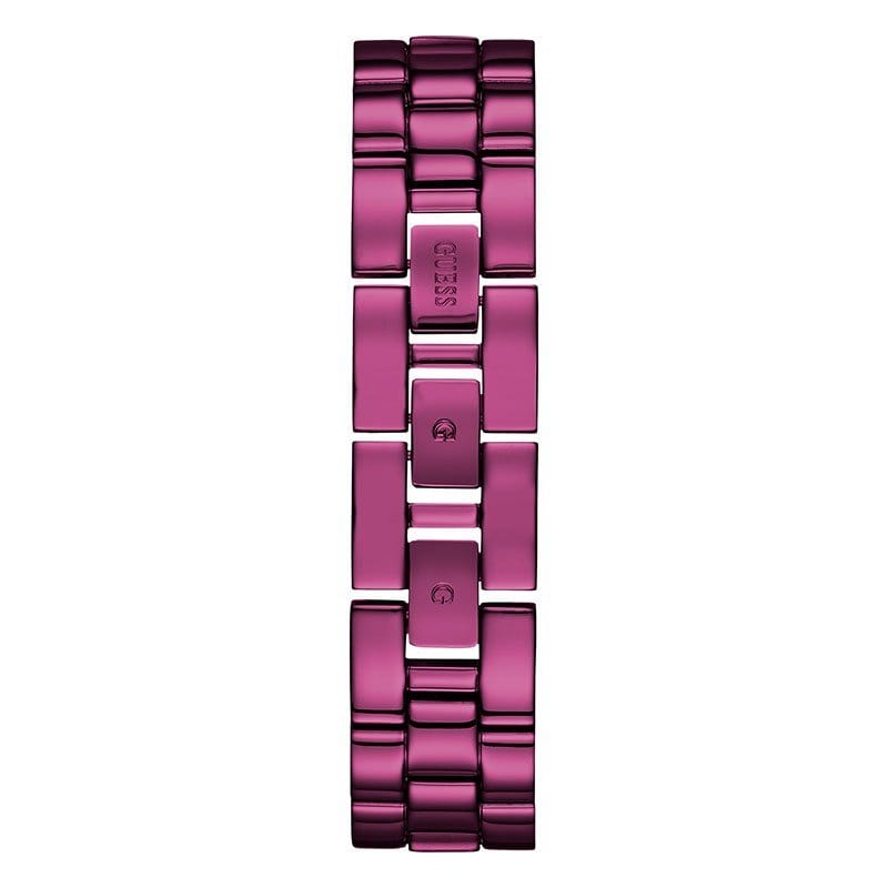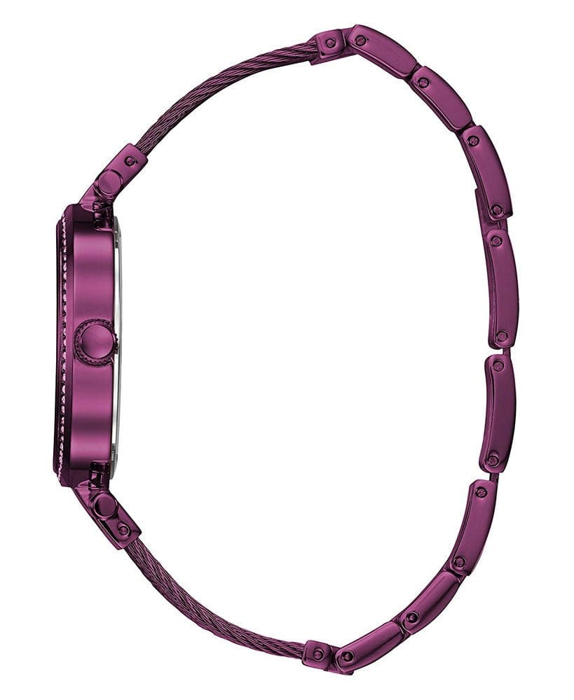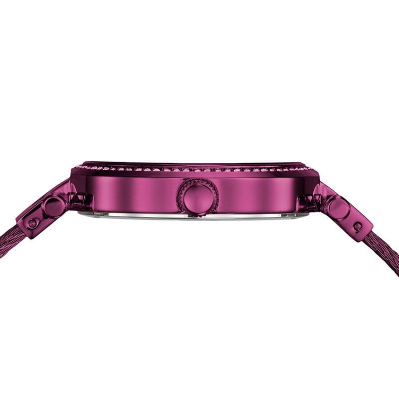 37mm diameter women's watch with precision QUARTZ mechanism . It has a purple dial with silver hands and details. Its purple colored stainless steel case is decorated with crystals and specially hardened mineral crystal. It has a purple stainless steel bracelet with a safety clasp. It is waterproof (3 ATM)