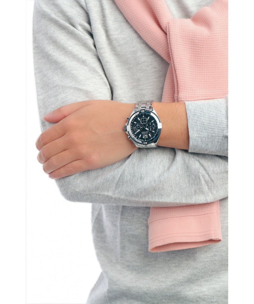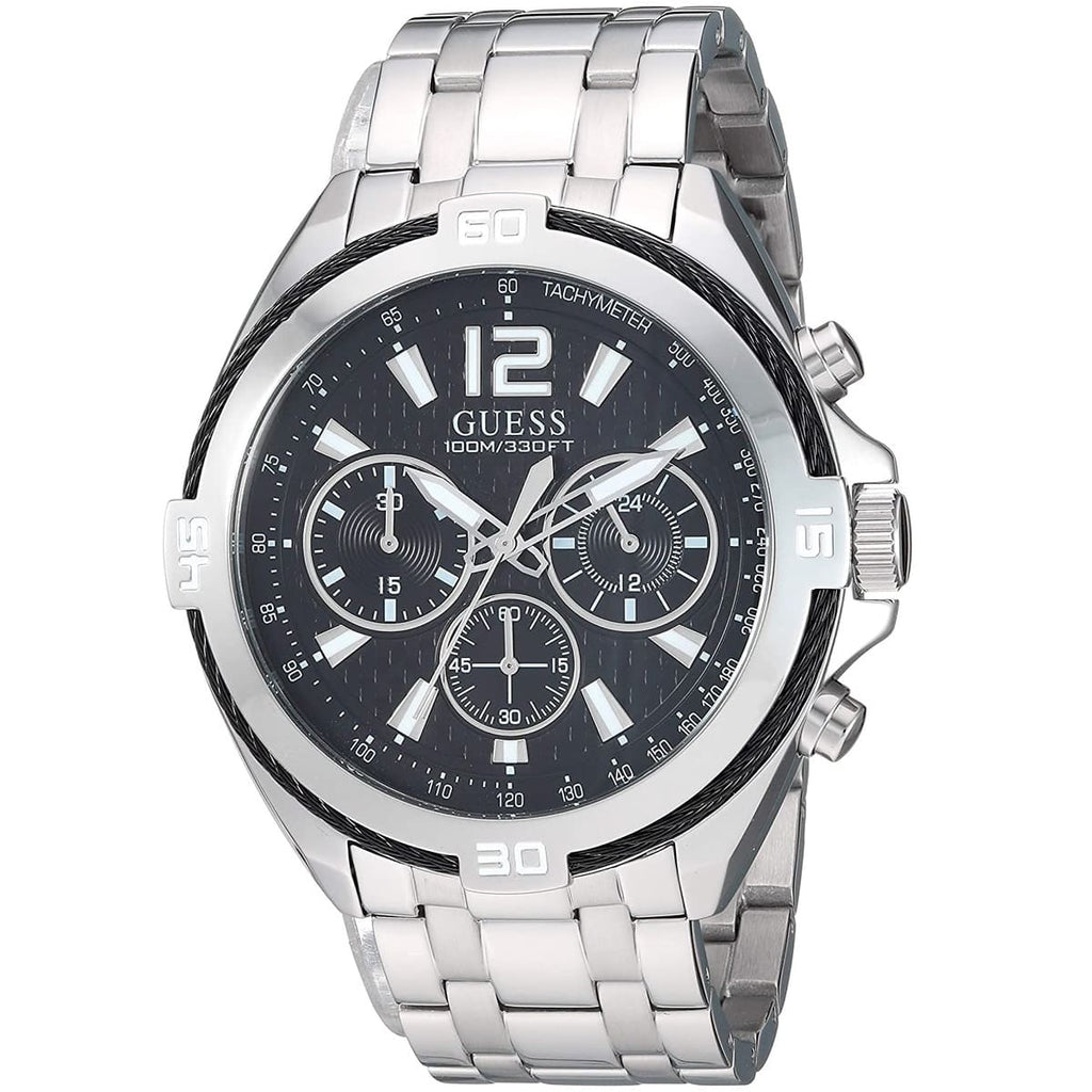 Guess Gents Silver Stainless Steel watch with Black Chronograph Dial giving a sporty look. It is shipped with its original box and official warranty card.