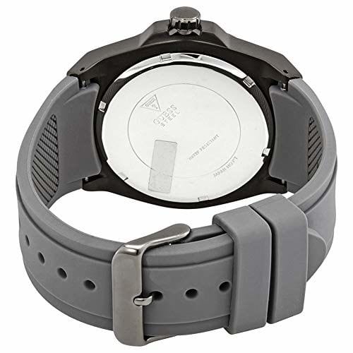 Gunmetal-plated stainless steel case with a grey Silicone Strap strap. Fixed gunmetal-plated bezel. Blue dial with luminous silver-tone hands and index hour markers. Minute markers around the outer rim. Dial Type: Analog. Luminescent hands and markers. Three multi-function sub-dials displaying: day of the week, date and 24 hour. Quartz movement. Scratch resistant mineral crystal. Screw down crown. Solid case back. Round case shape. Case size: 45 mm. Case thickness: 11 mm. Band width: 22 mm. Tang clasp. Water resistant at 100 meters / 330 feet. Functions: date, day, hour, minute, second. 24 hour. Sport watch style. Watch label: Japan Movt. Guess Legacy Multi-Function Blue Dial Gunmetal-plated Men’s Watch W1048G1.